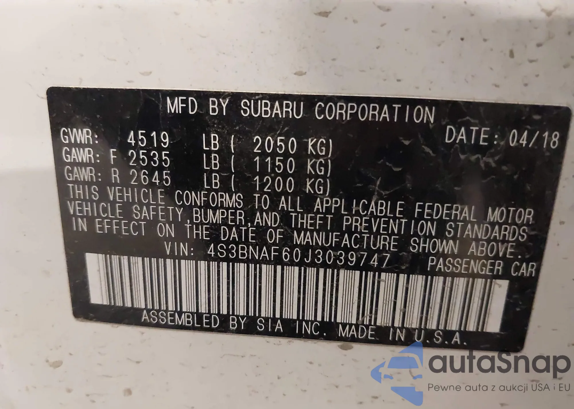 LOT: 42493109 VIN: 4S3BNAF60J3039747