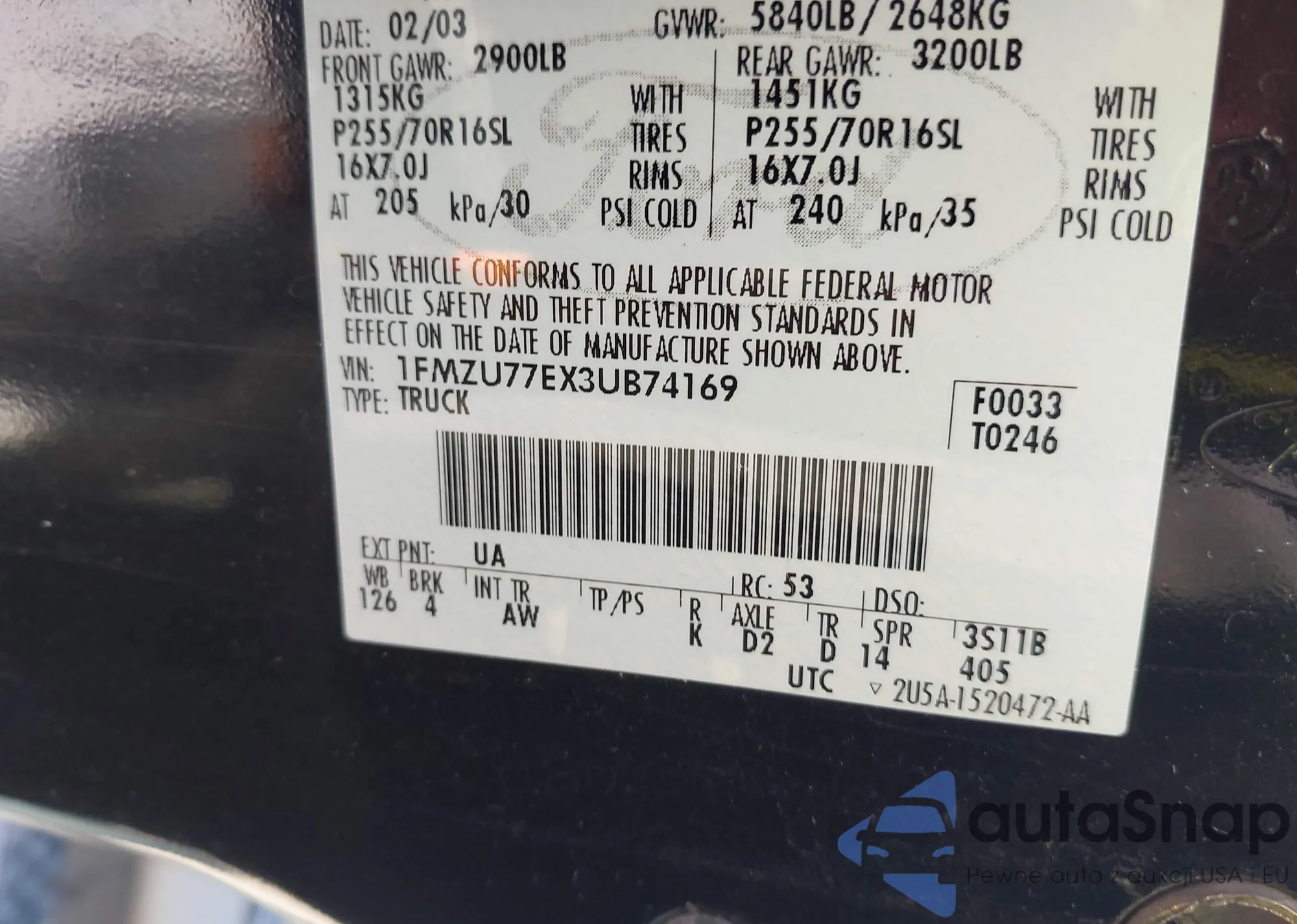 • VIN 1FMZU77EX3UB74169