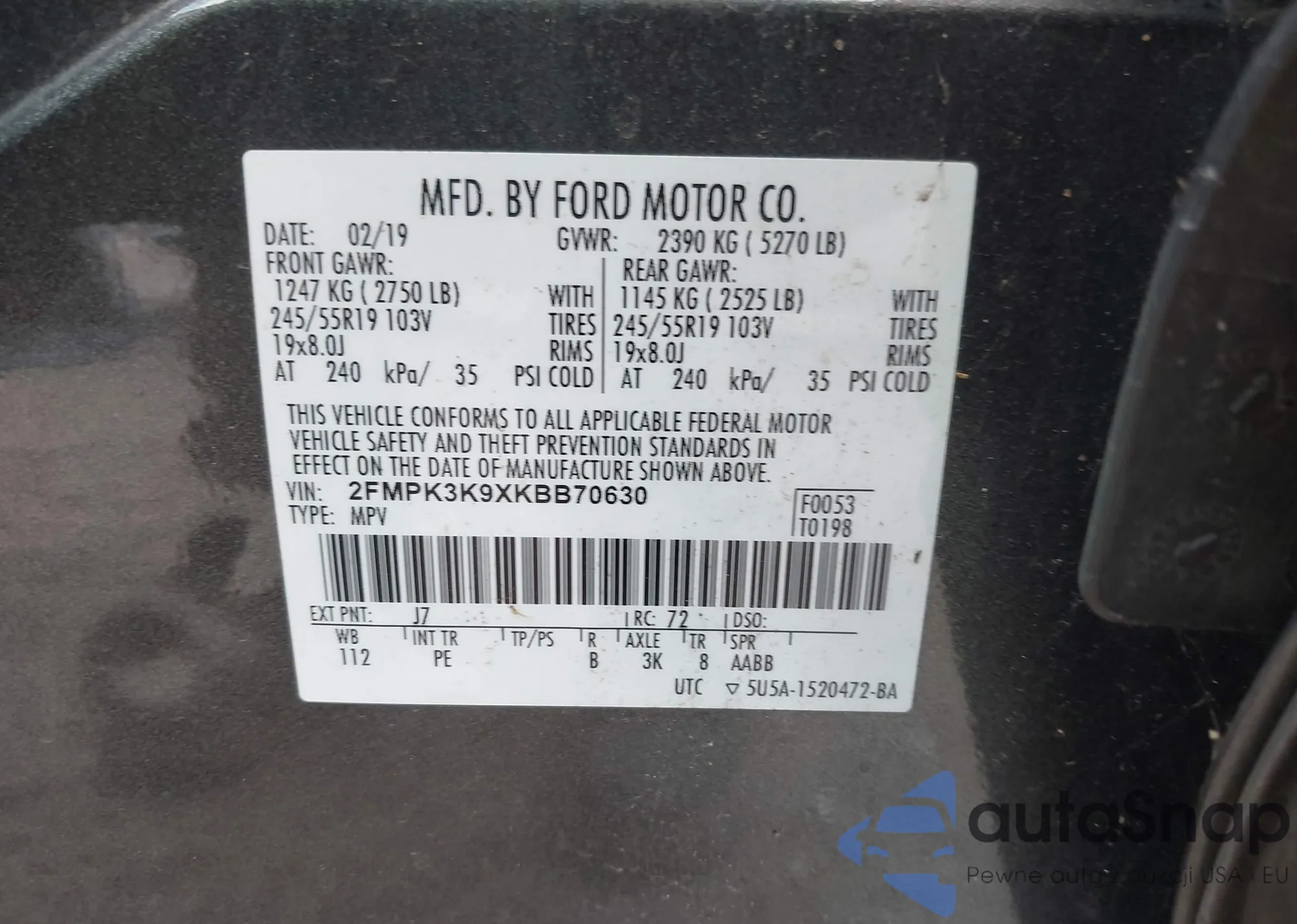 • VIN 2FMPK3K9XKBB70630