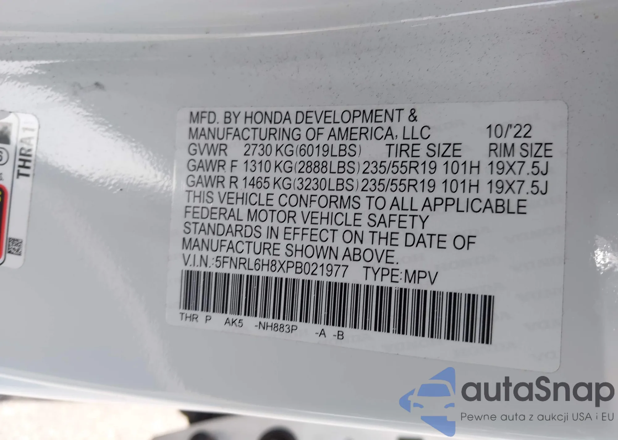 • VIN 5FNRL6H8XPB021977