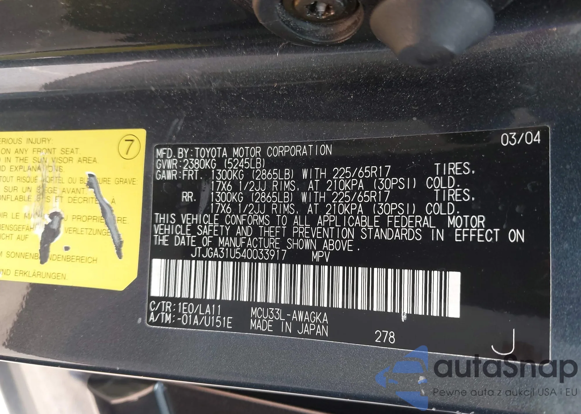 • VIN 5TFCZ5AN1HX052217