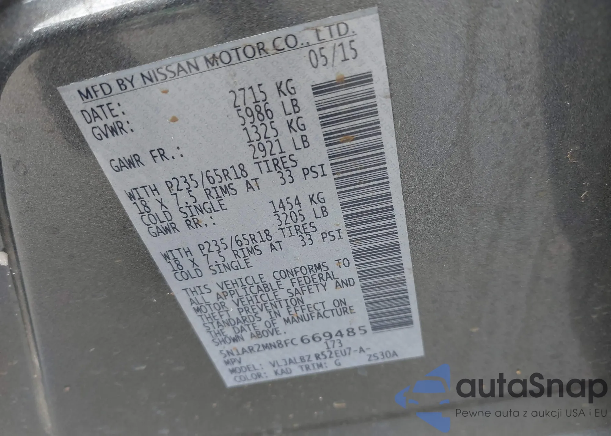 LOT: 42626916 VIN: 5N1AR2MN8FC669485