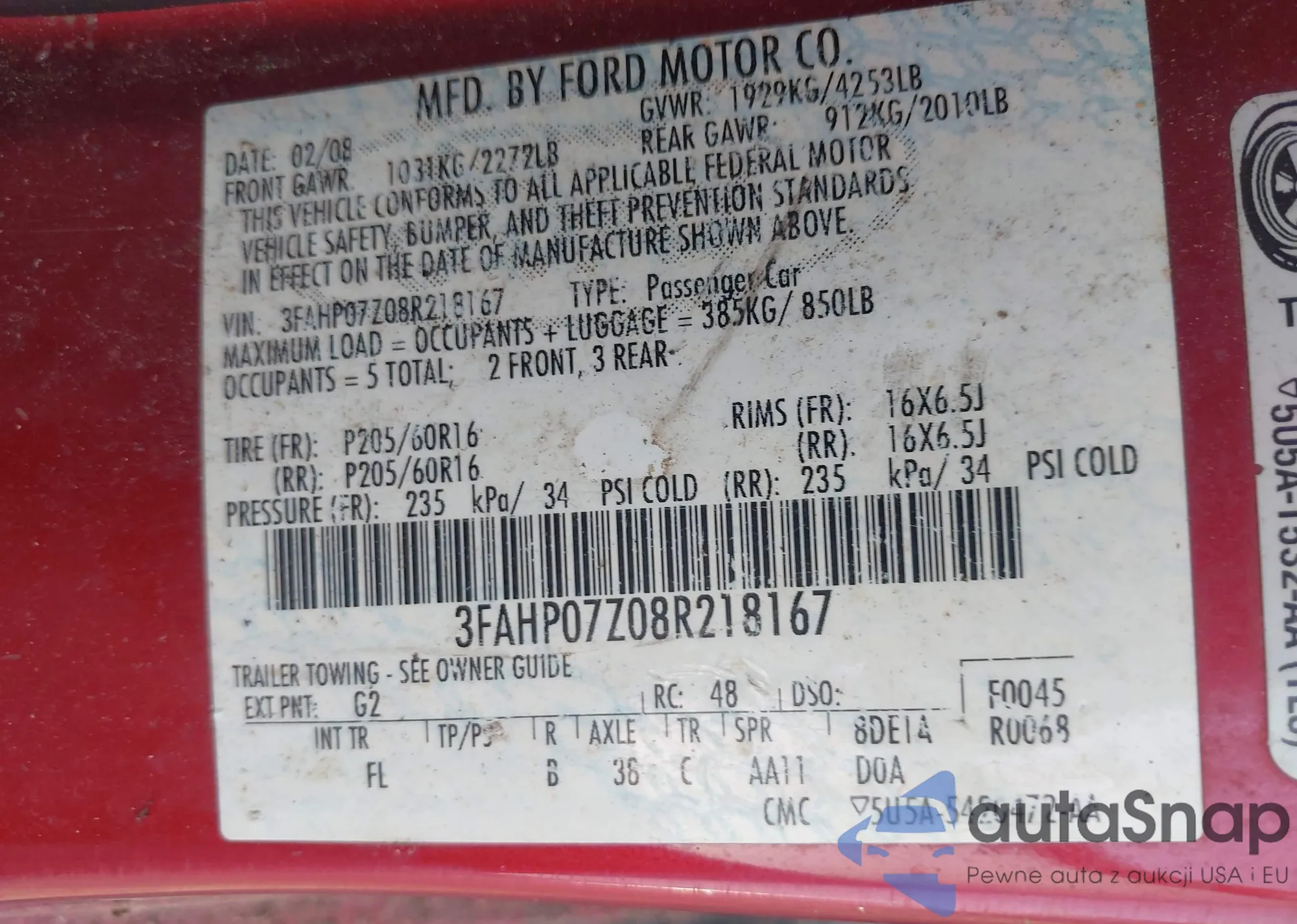 LOT: 42315862 VIN: 1FAHP3F20CL138736
