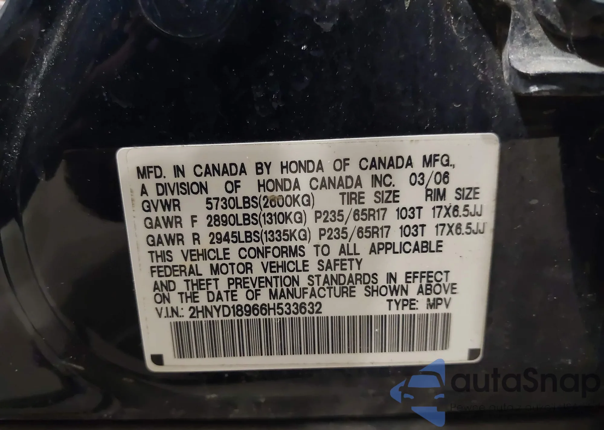 LOT: 42573458 VIN: 2HNYD18966H533632