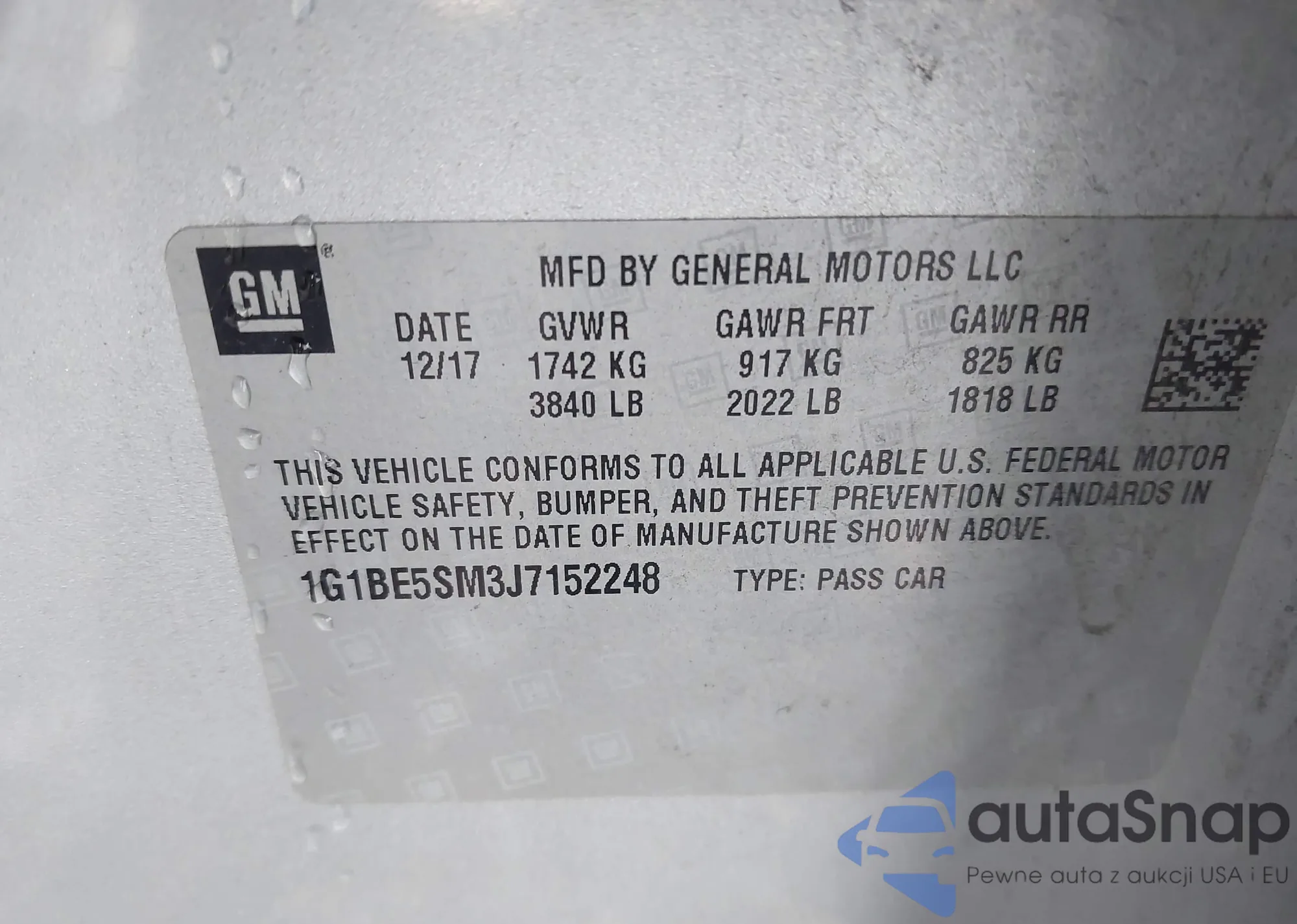 LOT: 40864370 VIN: 1G1BE5SM3J7152248