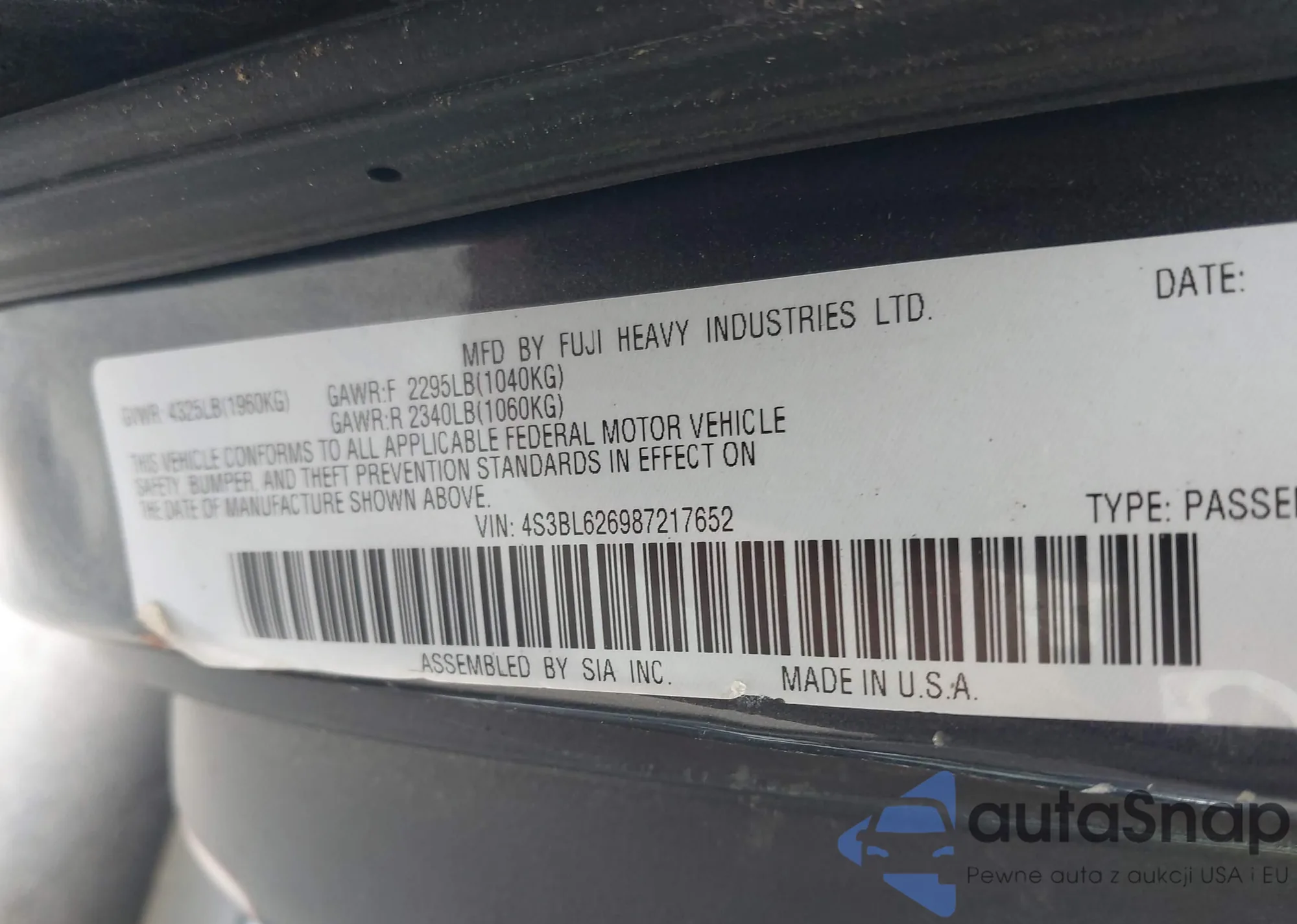 LOT: 42309681 VIN: 4S3BL626987217652