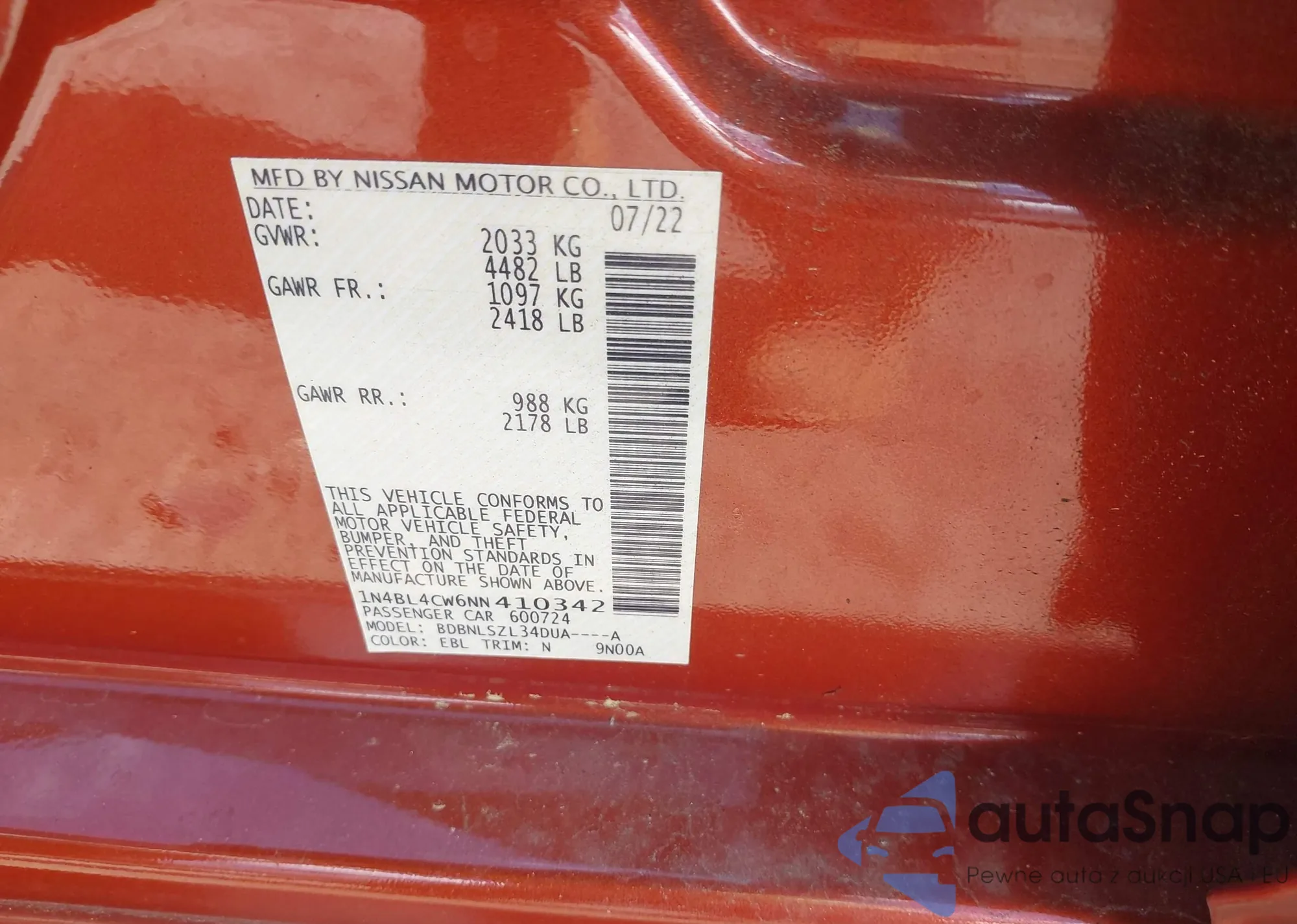 LOT: 42188617 VIN: 1N4BL4CW6NN410342