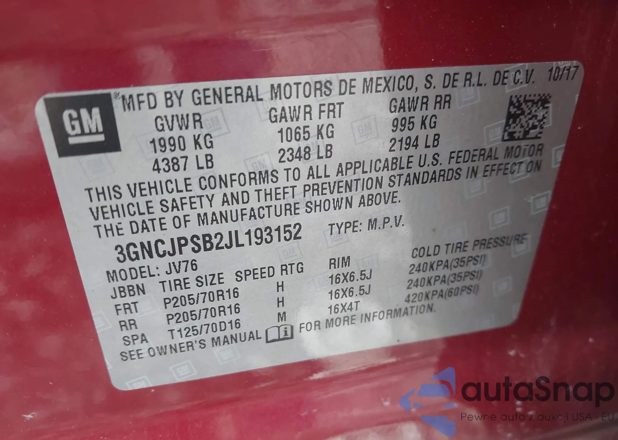 • VIN 3GNCJPSB2JL193152