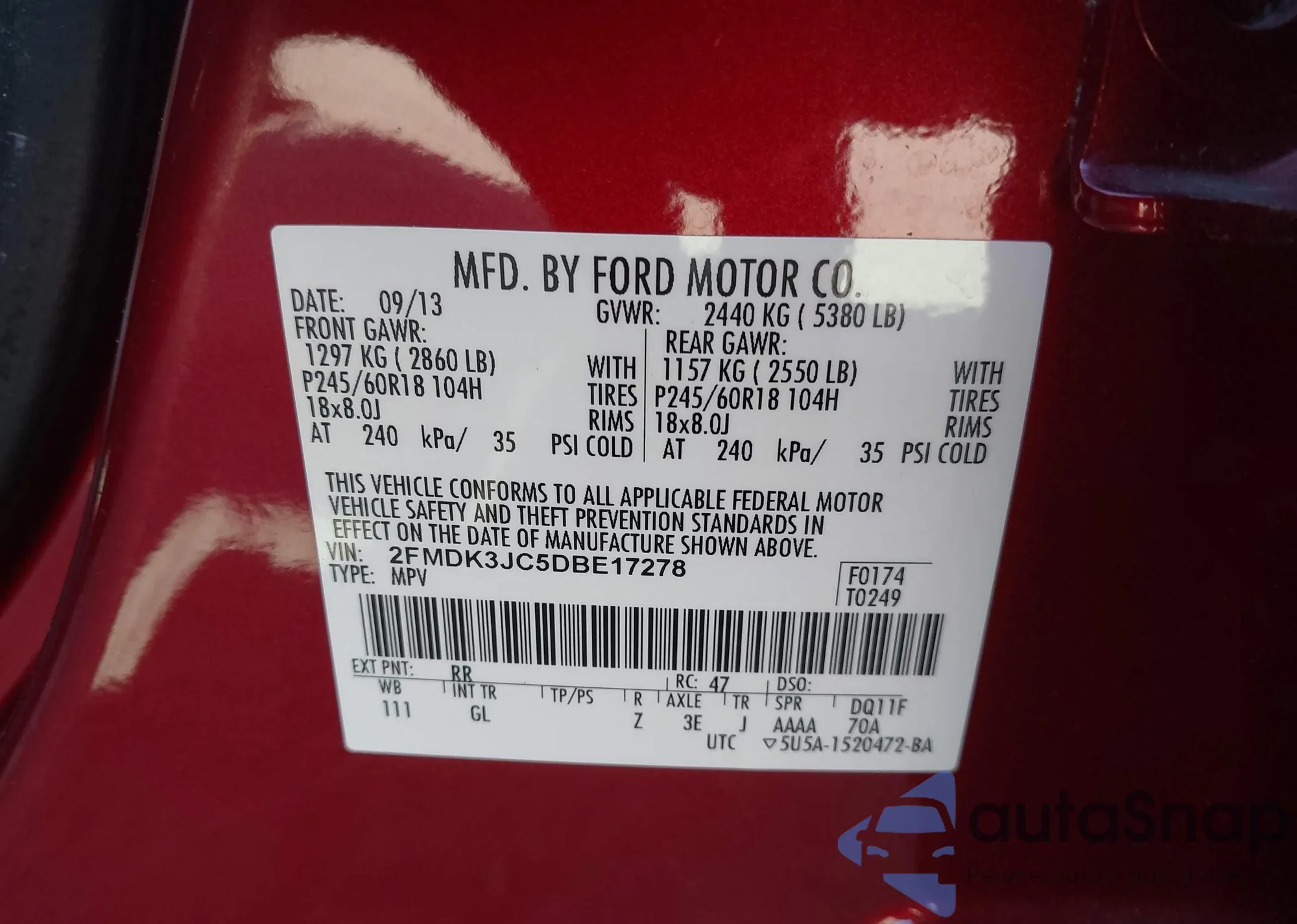 LOT: 42501473 VIN: 2FMDK3JC5DBE17278