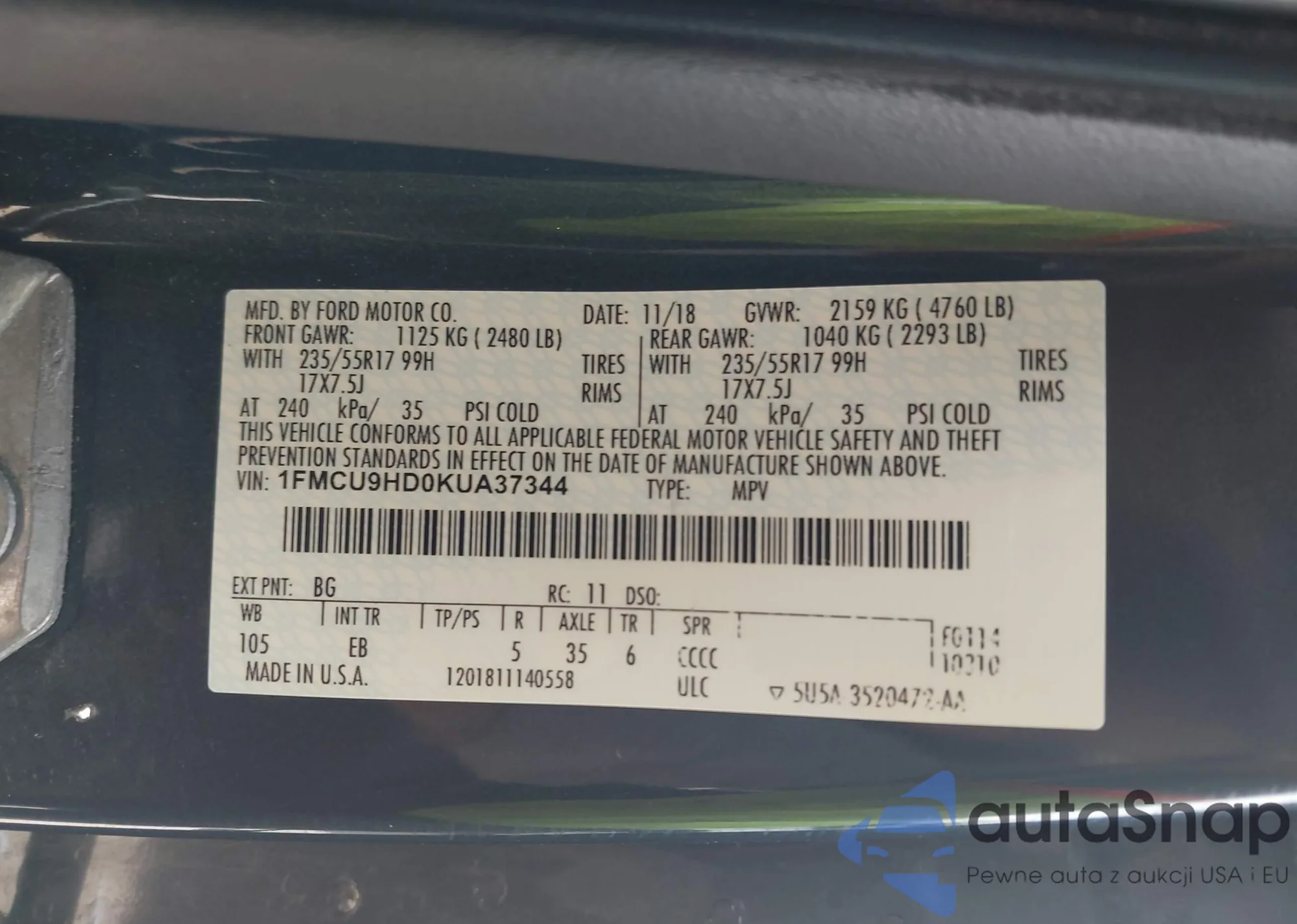 • VIN 1FMCU9HD0KUA37344
