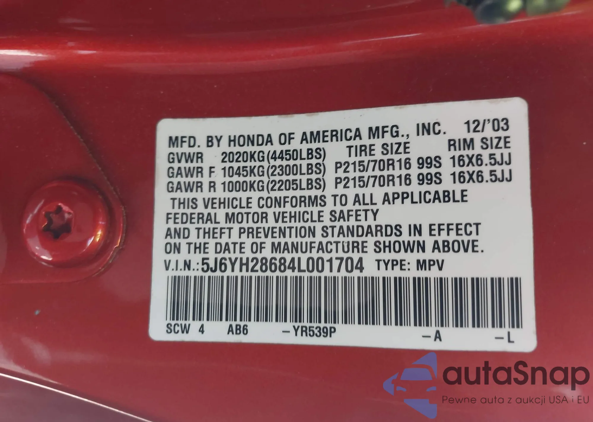 • VIN 5J6YH28684L001704