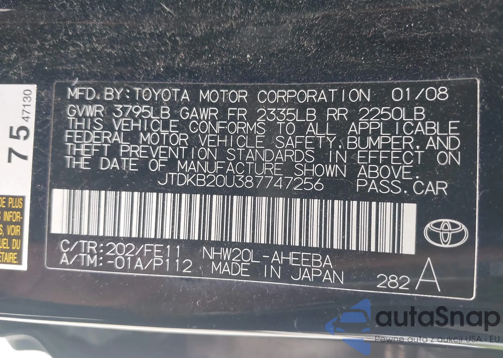 • VIN JTDKB20U387747256