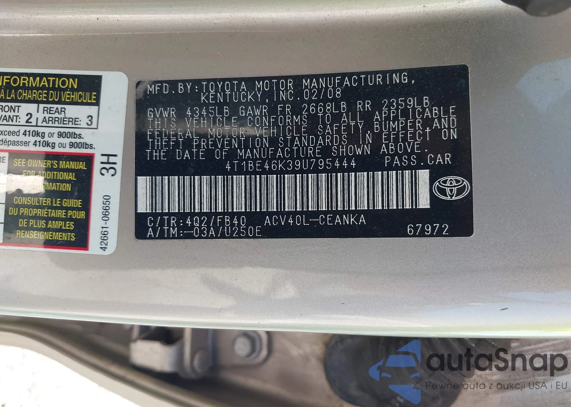 LOT: 42570580 VIN: 4T1BE46K39U795444