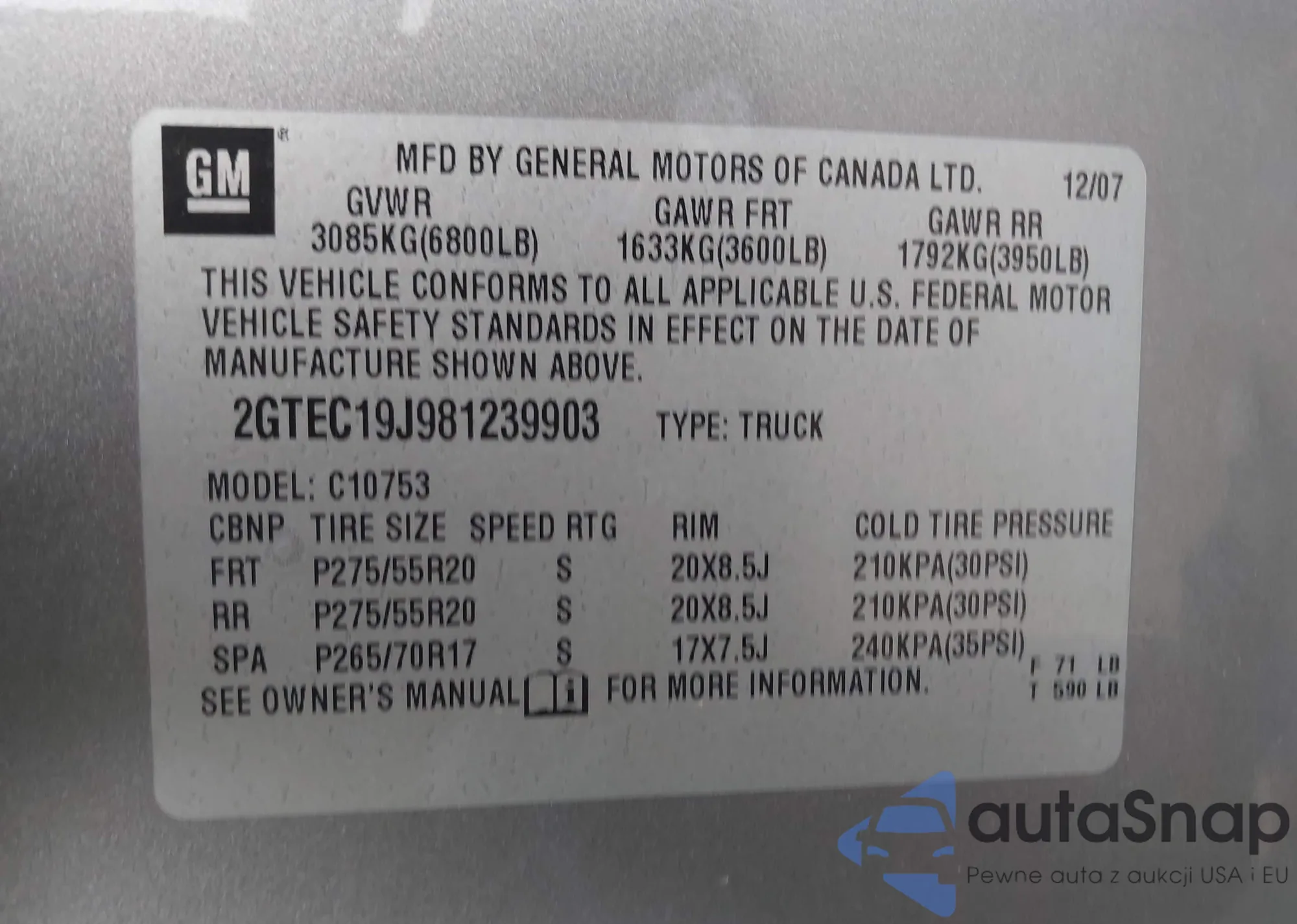 • VIN 2GTEC19J981239903