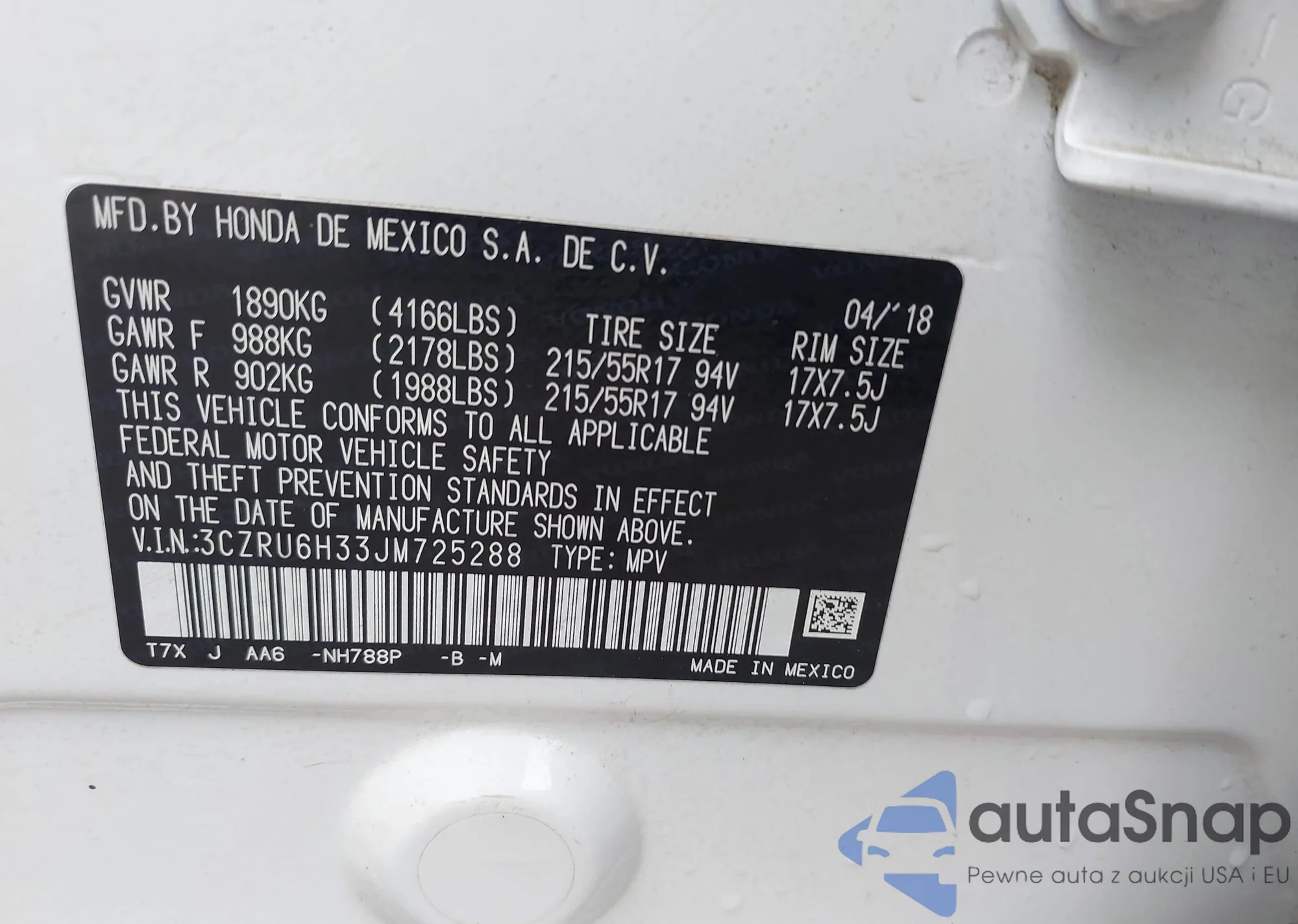 • VIN 3CZRU6H33JM725288