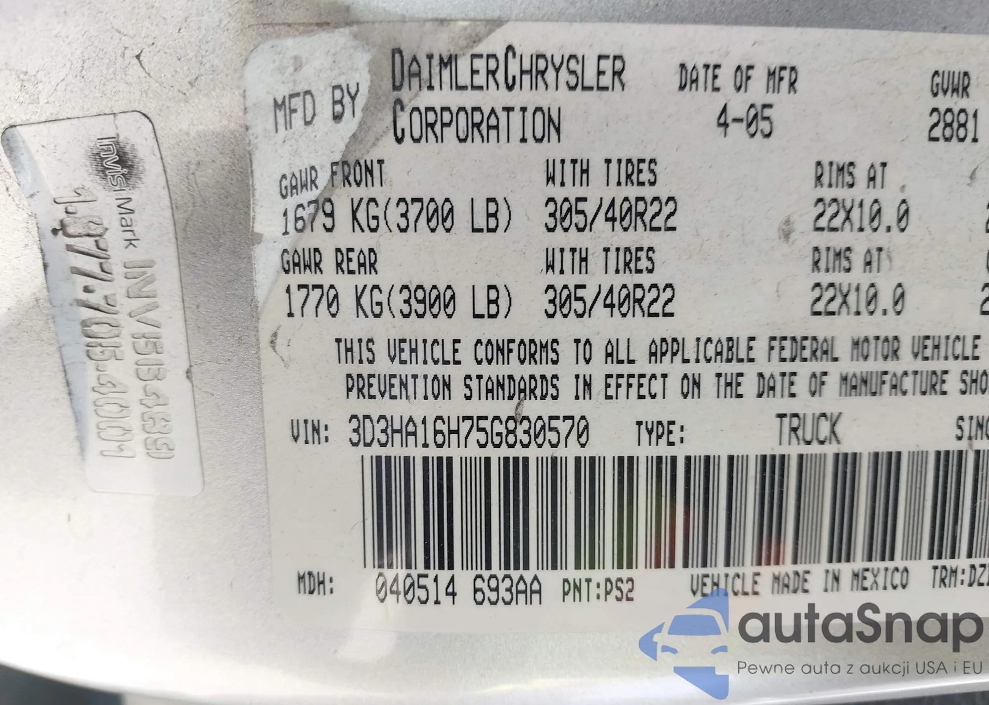 LOT: 42586838 VIN: 3D3HA16H75G830570