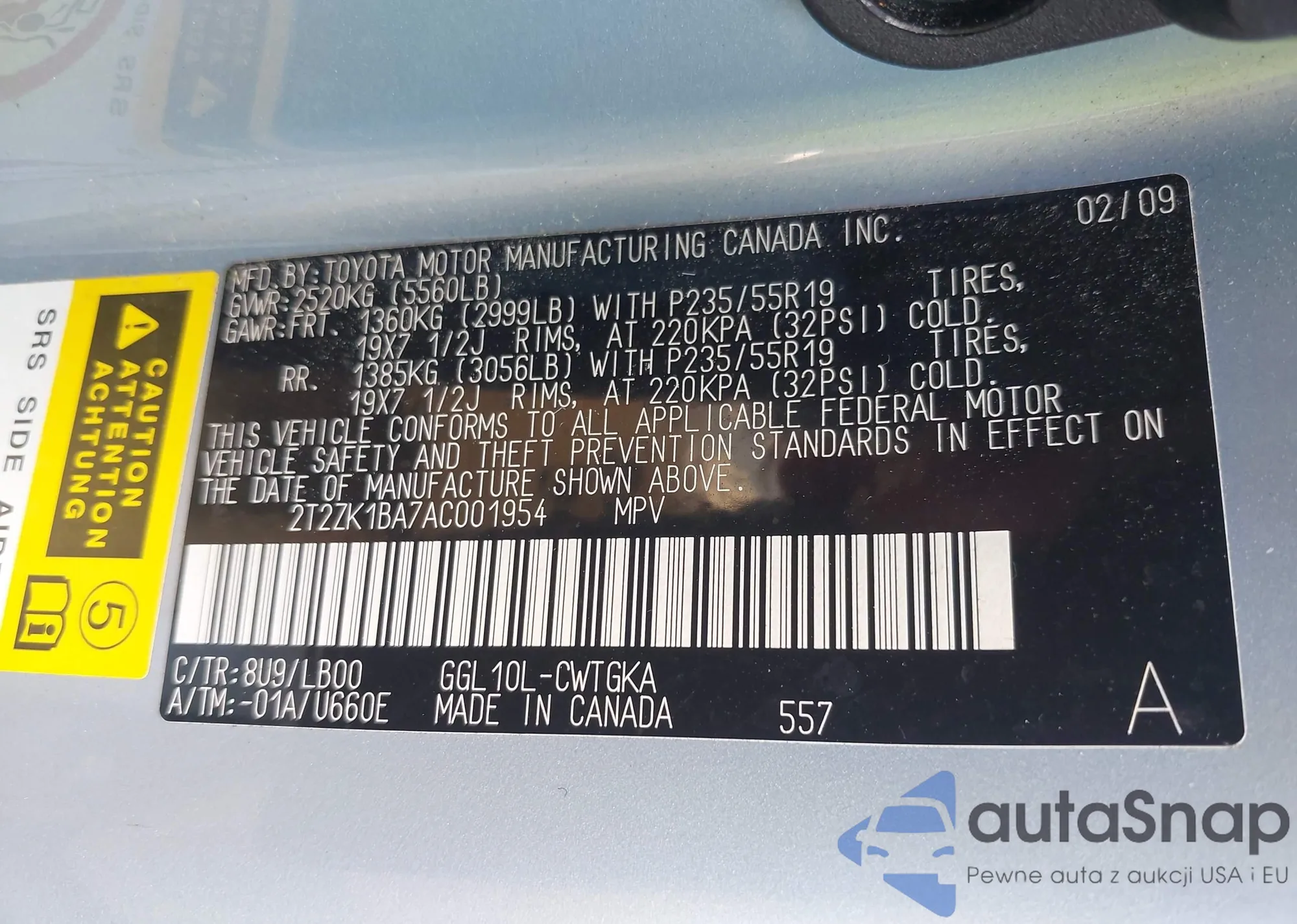 • VIN 2T2ZK1BA7AC001954