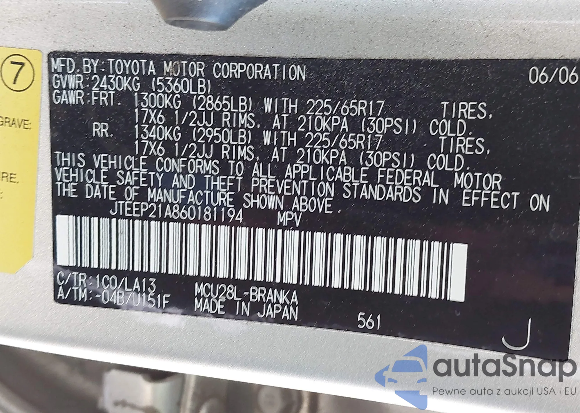 • VIN 4T1BK36BX7U210309