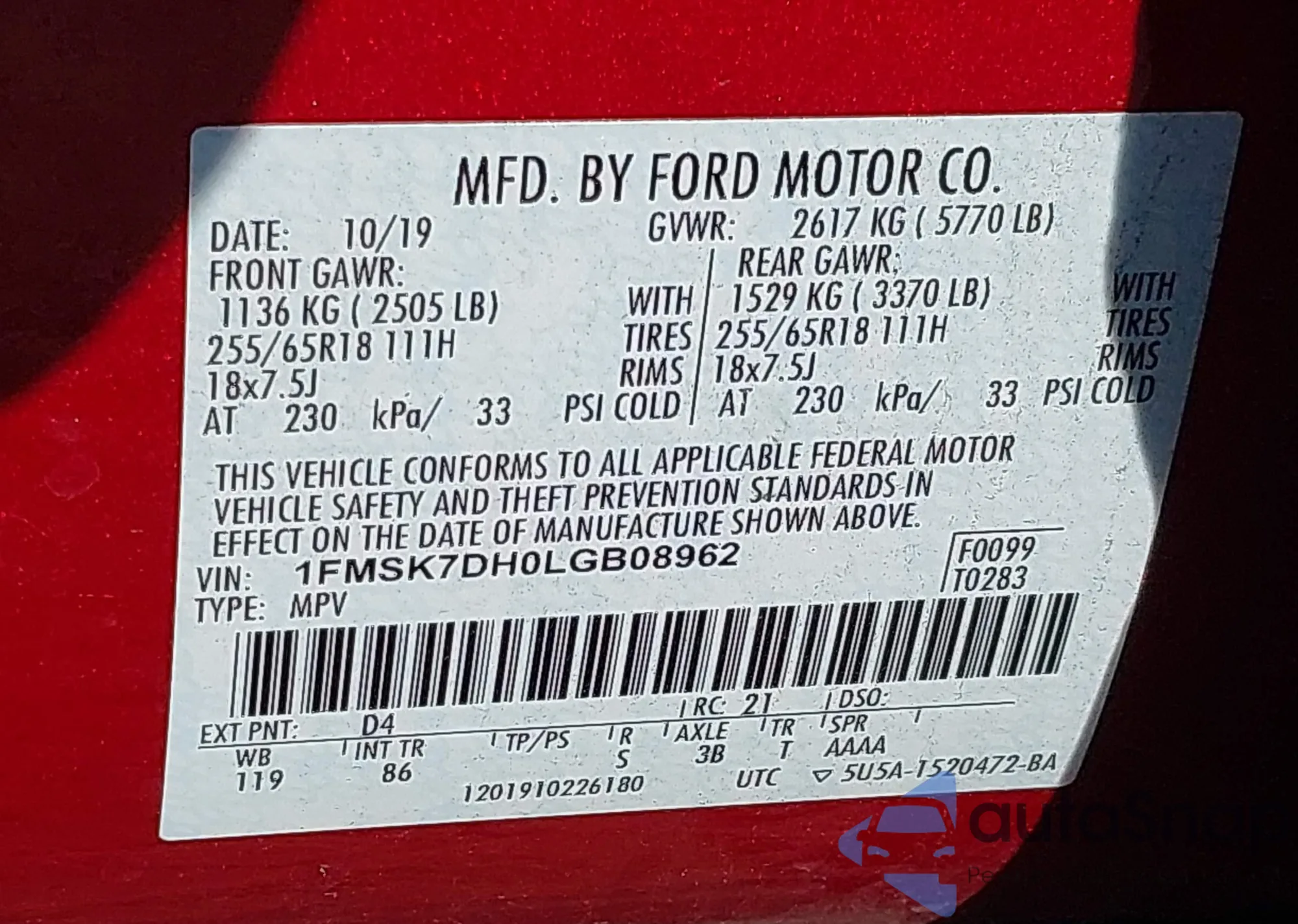 LOT: 40641836 VIN: 1FMSK7DH0LGB08962