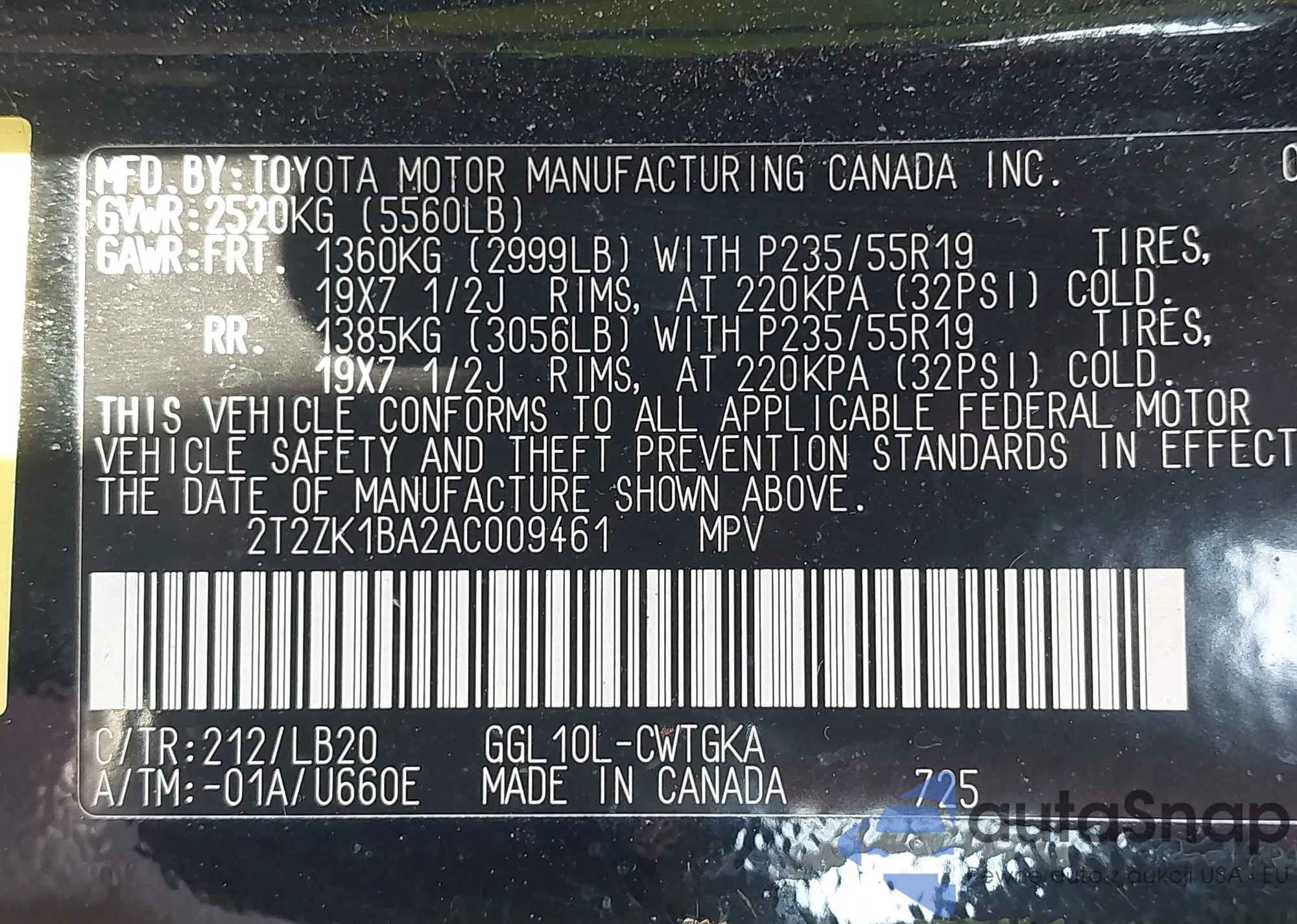 • VIN 2T2ZK1BA2AC009461
