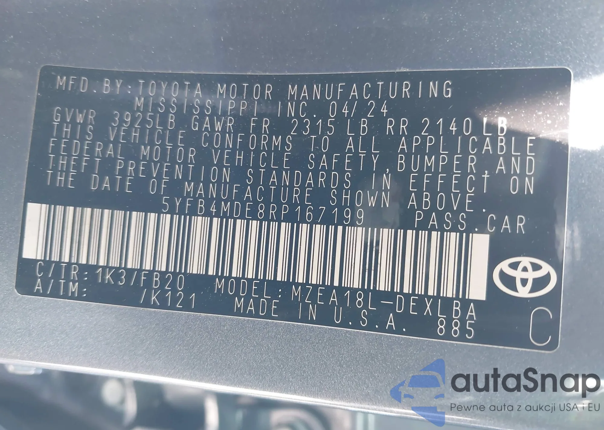 • VIN 5YFB4MDE8RP167199
