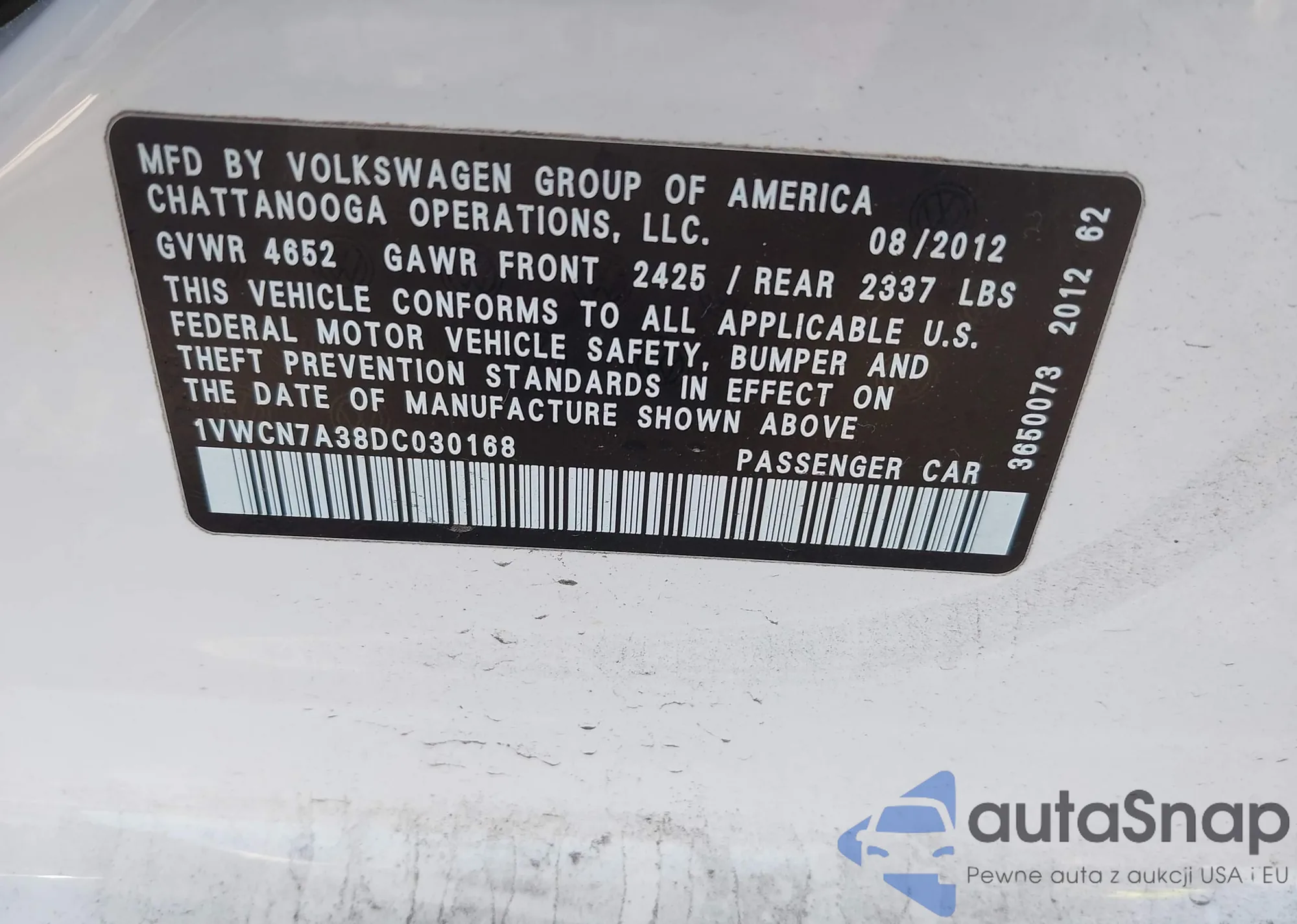 • VIN 1VWCN7A38DC030168