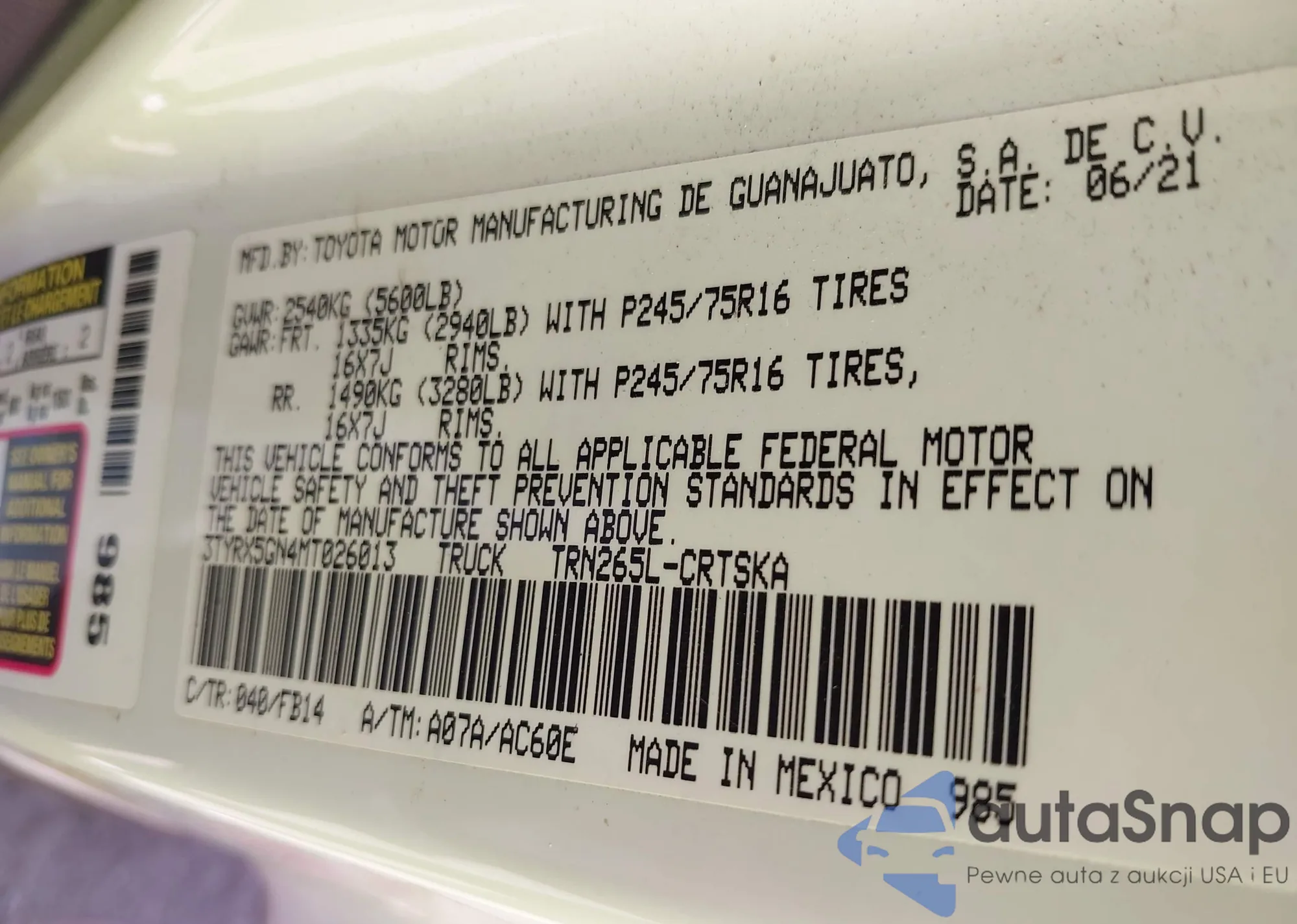 • VIN 3TYRX5GN4MT026013