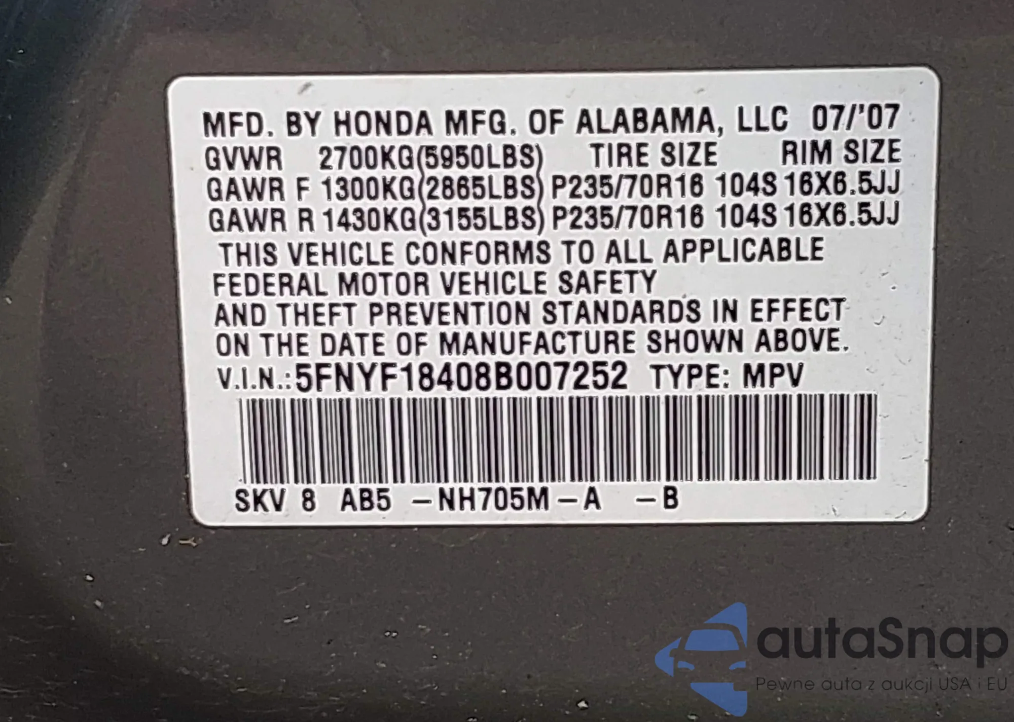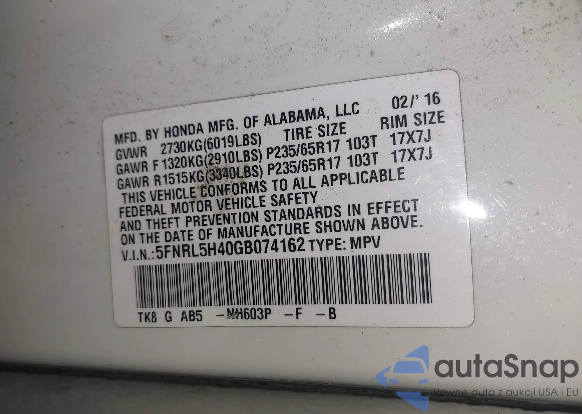 • VIN 5FNRL5H40GB074162