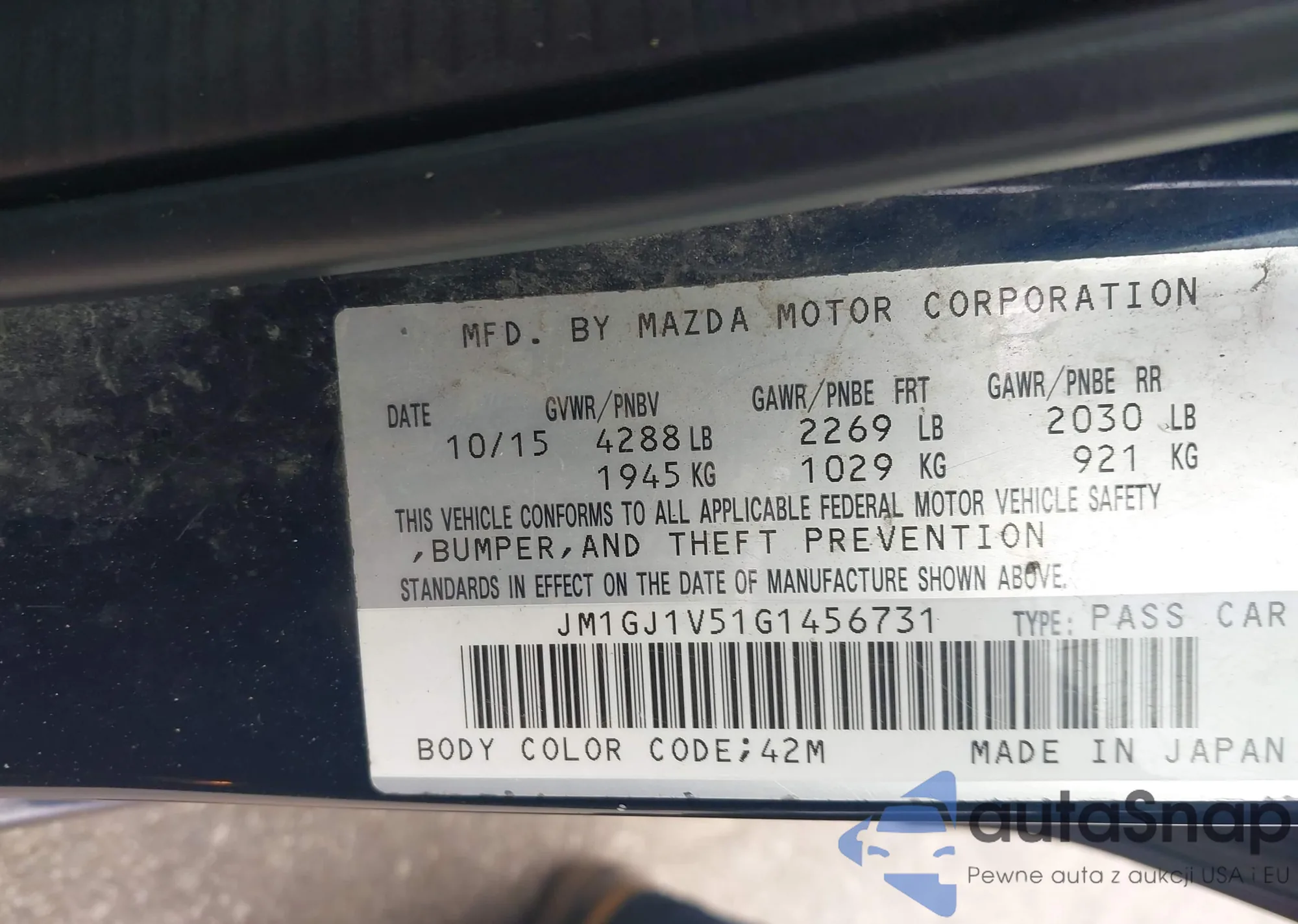 LOT: 42381870 VIN: JM1GJ1V51G1456731
