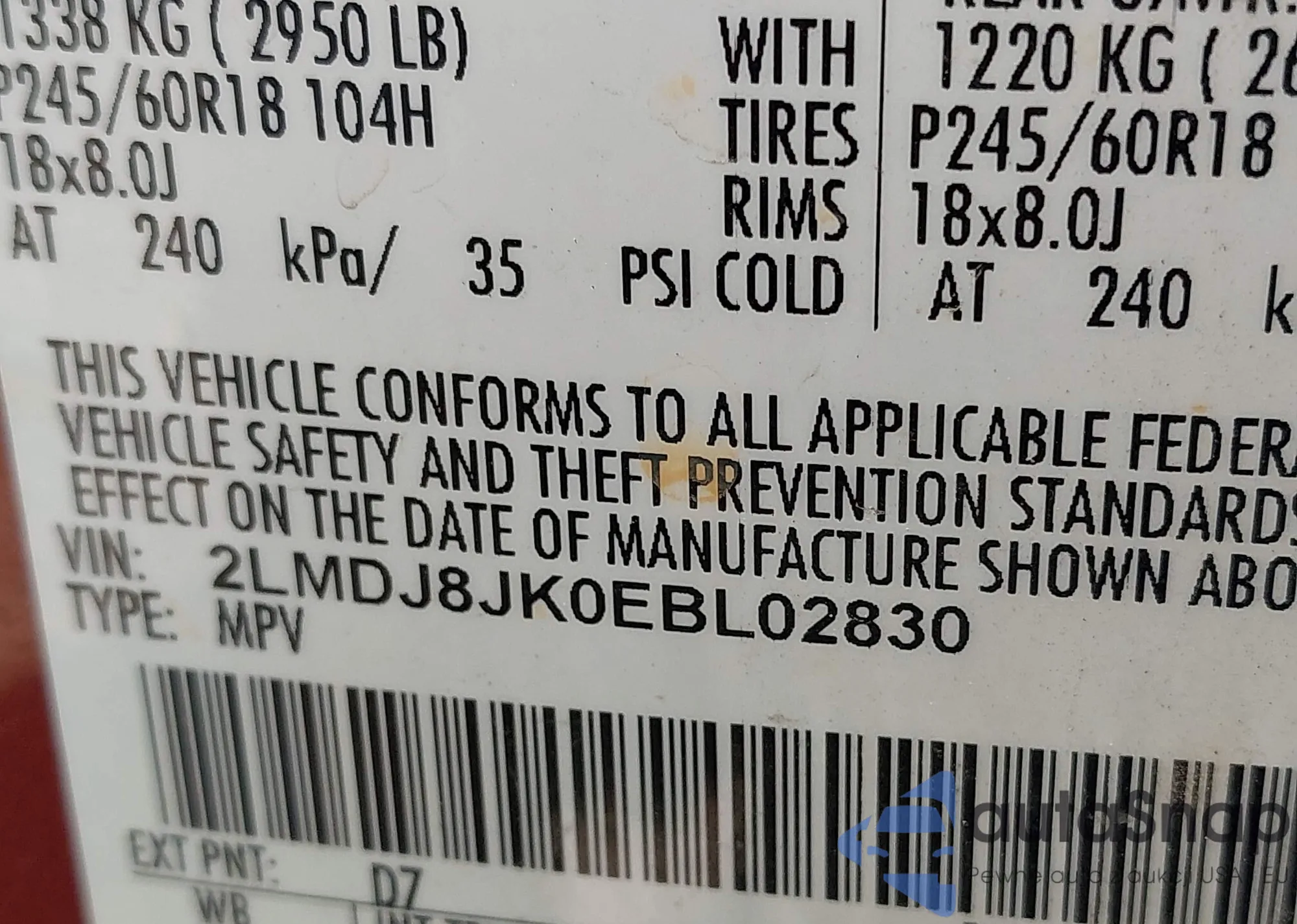 LOT: 42541926 VIN: 2LMDJ8JK0EBL02830