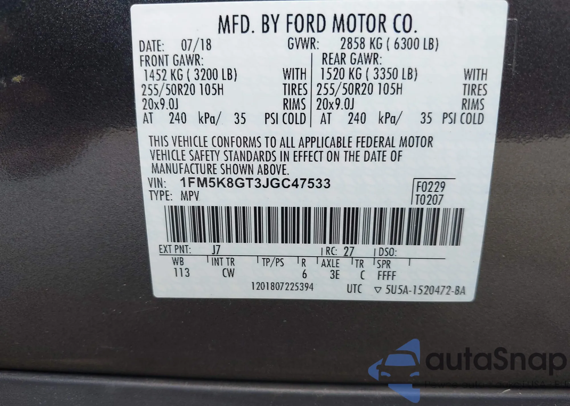 • VIN 1FM5K8GT3JGC47533