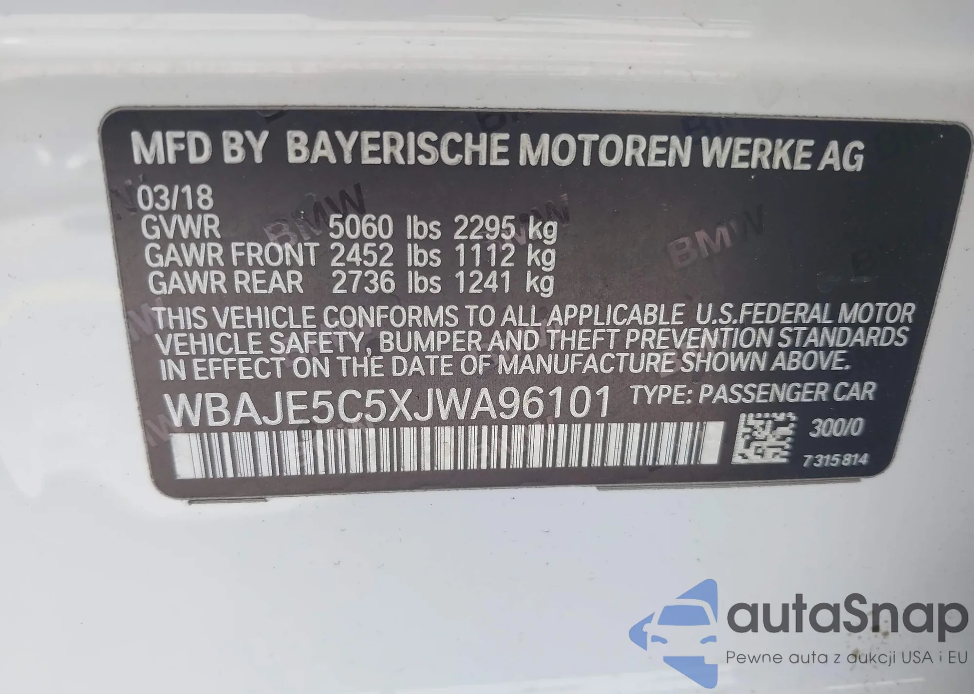 LOT: 42268201 VIN: WBAJE5C5XJWA96101