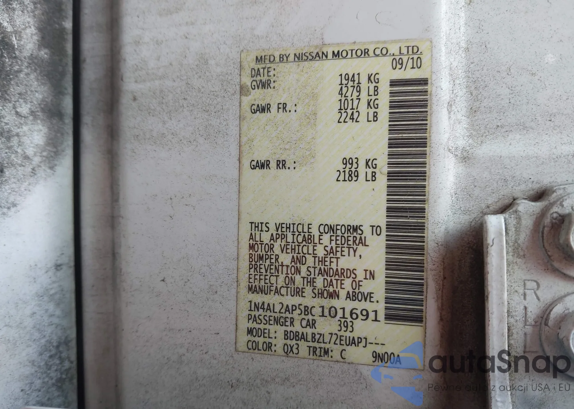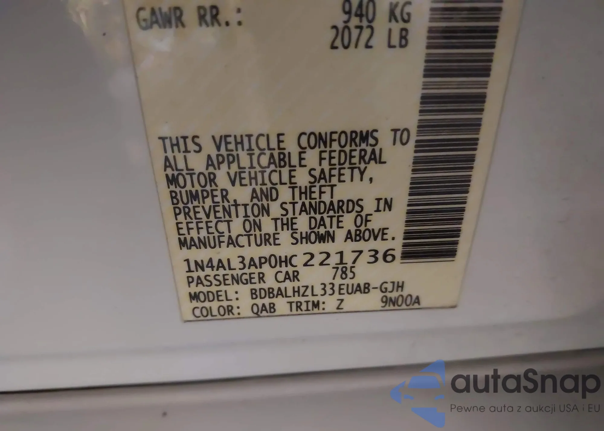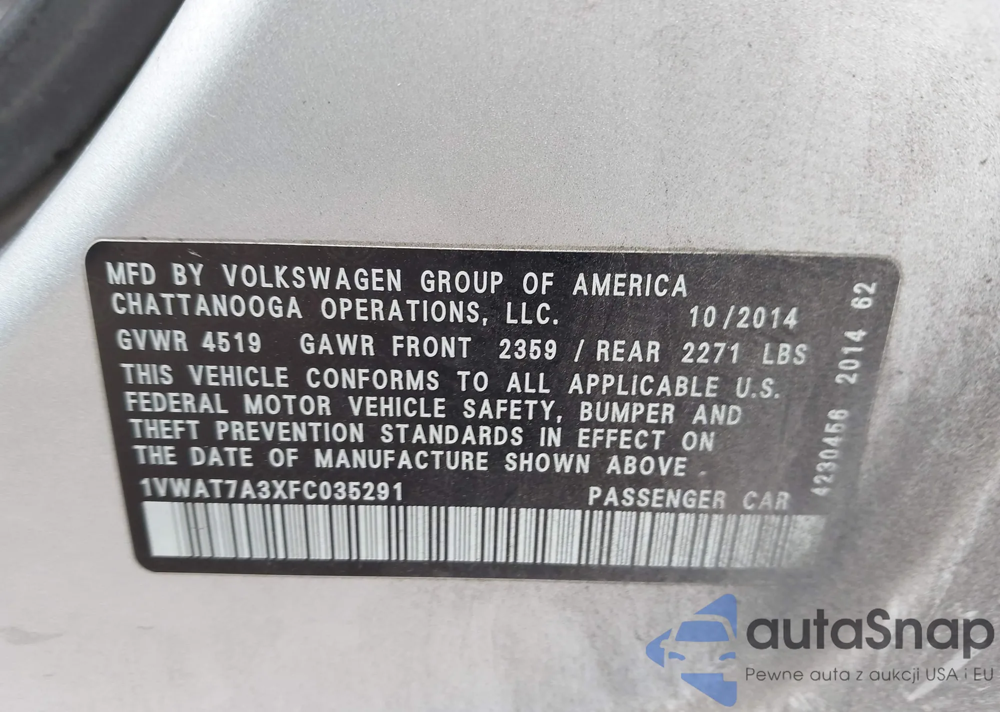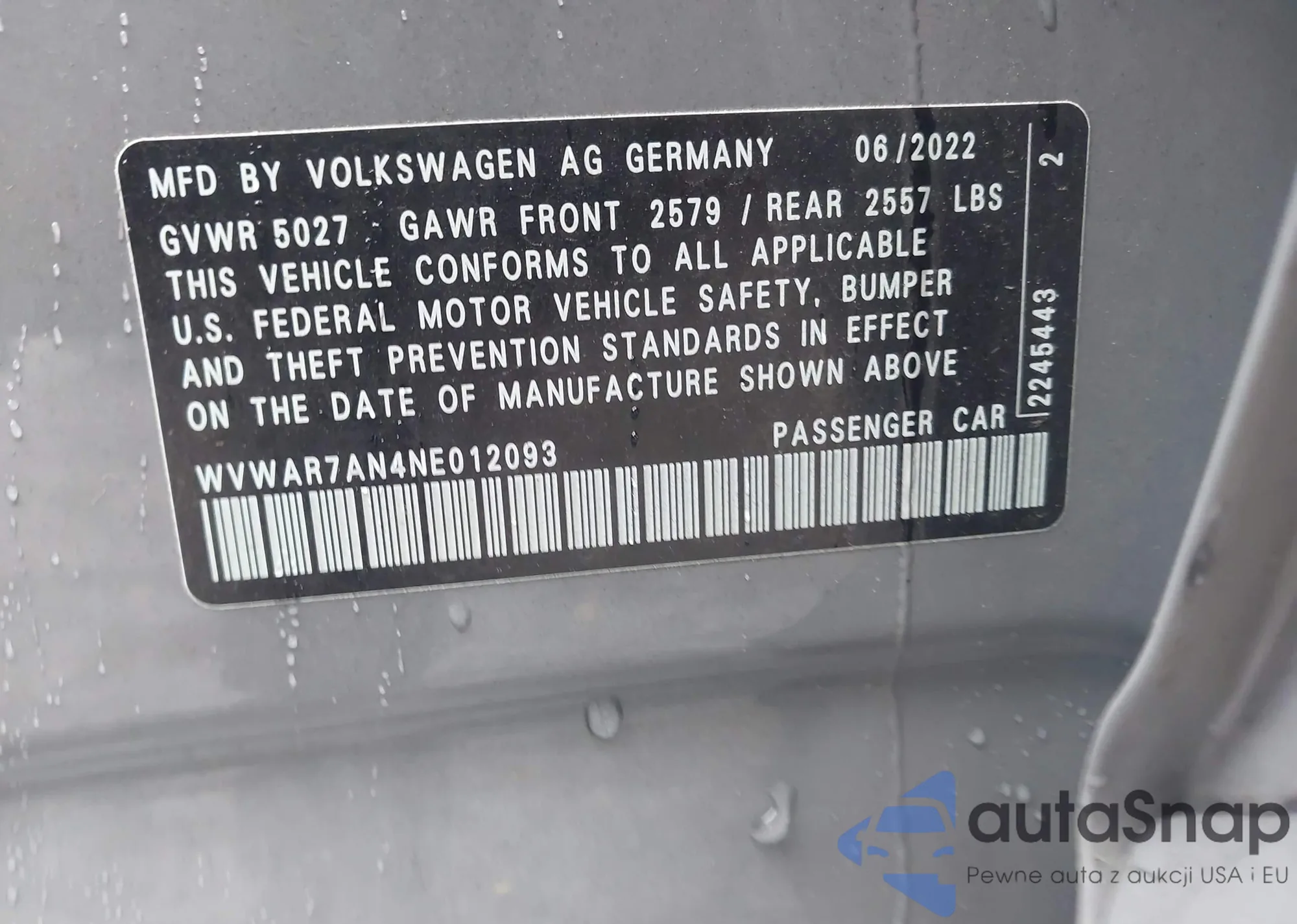 LOT: 42263932 VIN: WVWAR7AN4NE012093