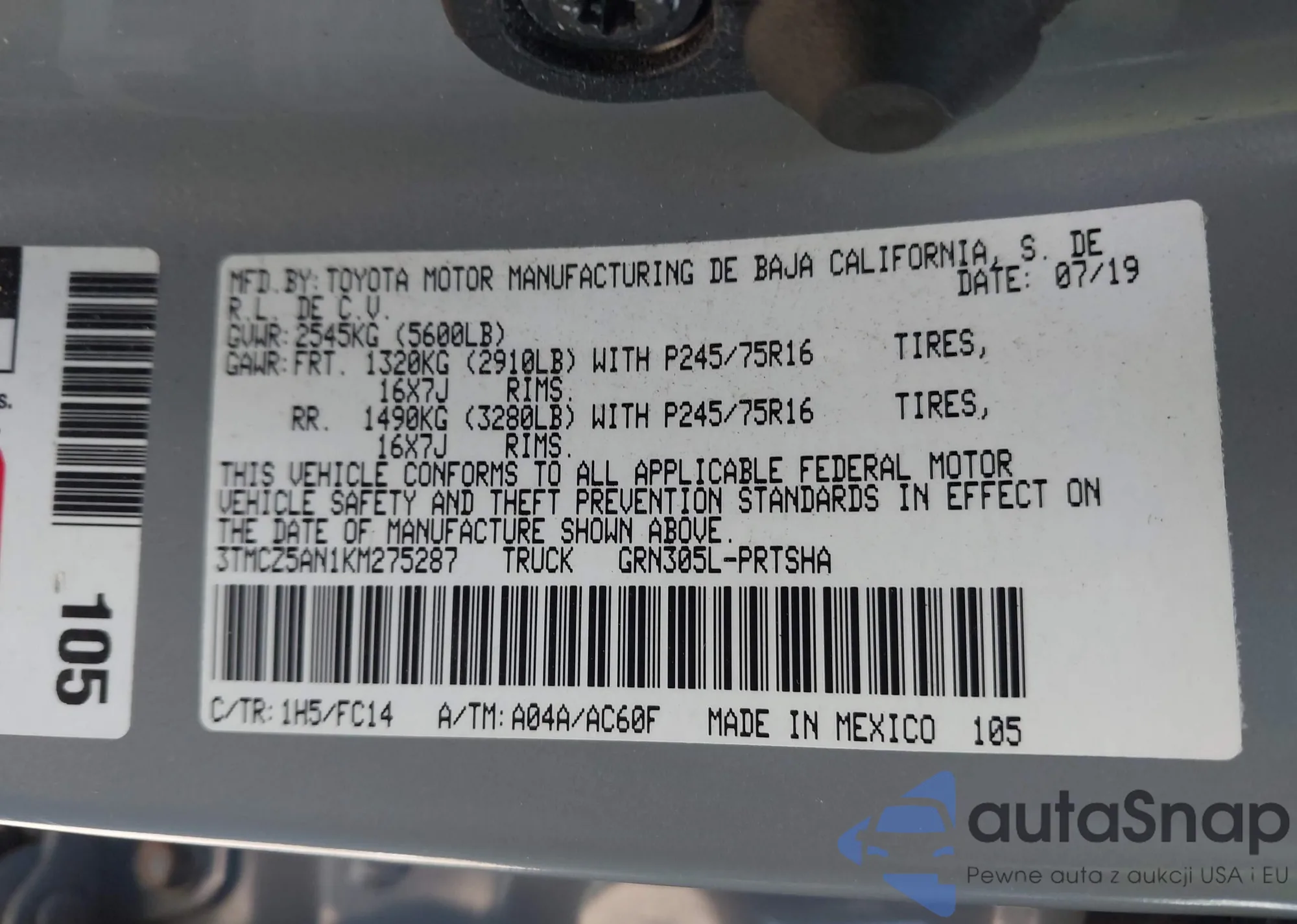 • VIN 3TMCZ5AN1KM275287