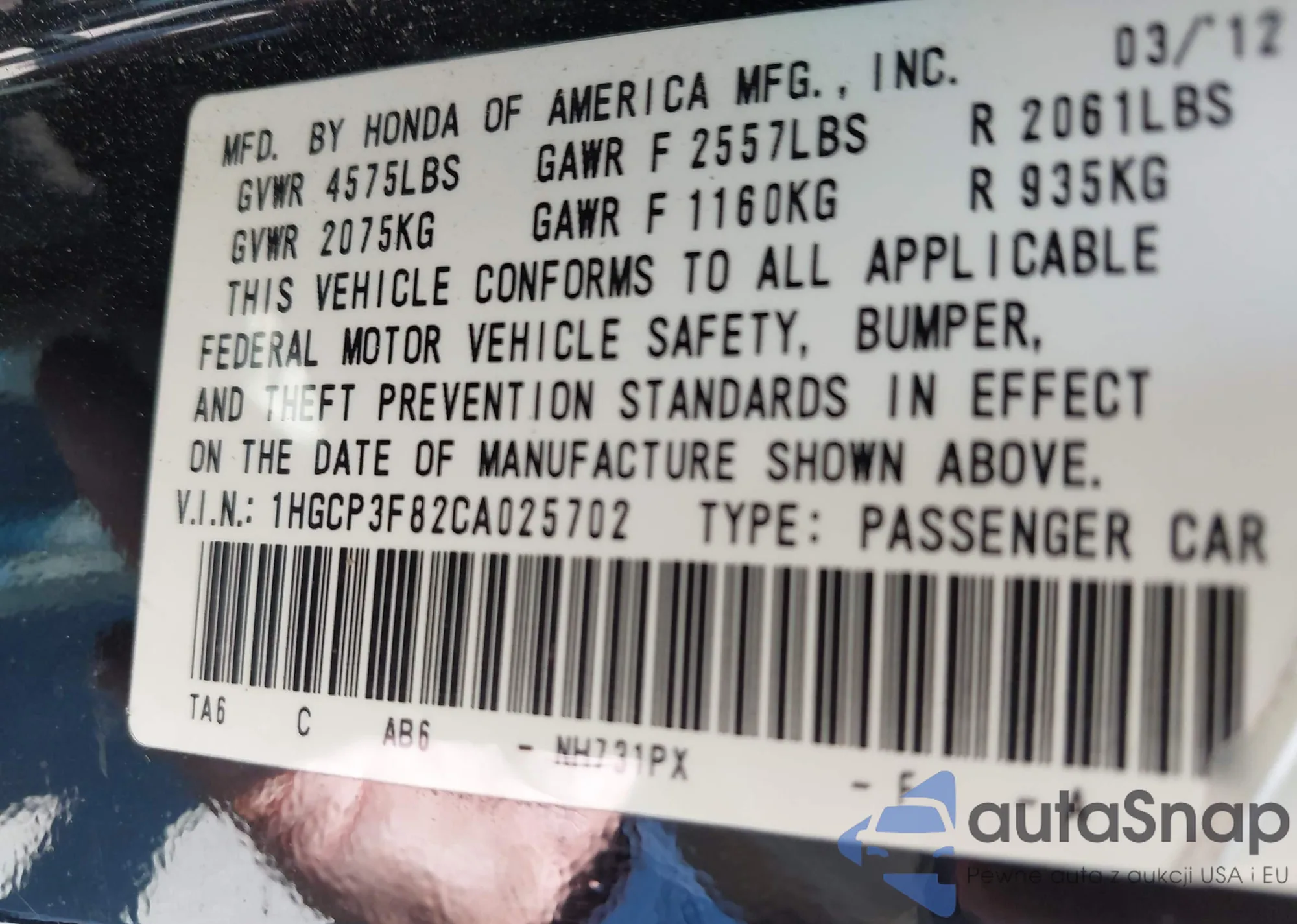 LOT: 42230409 VIN: 1HGCP3F82CA025702
