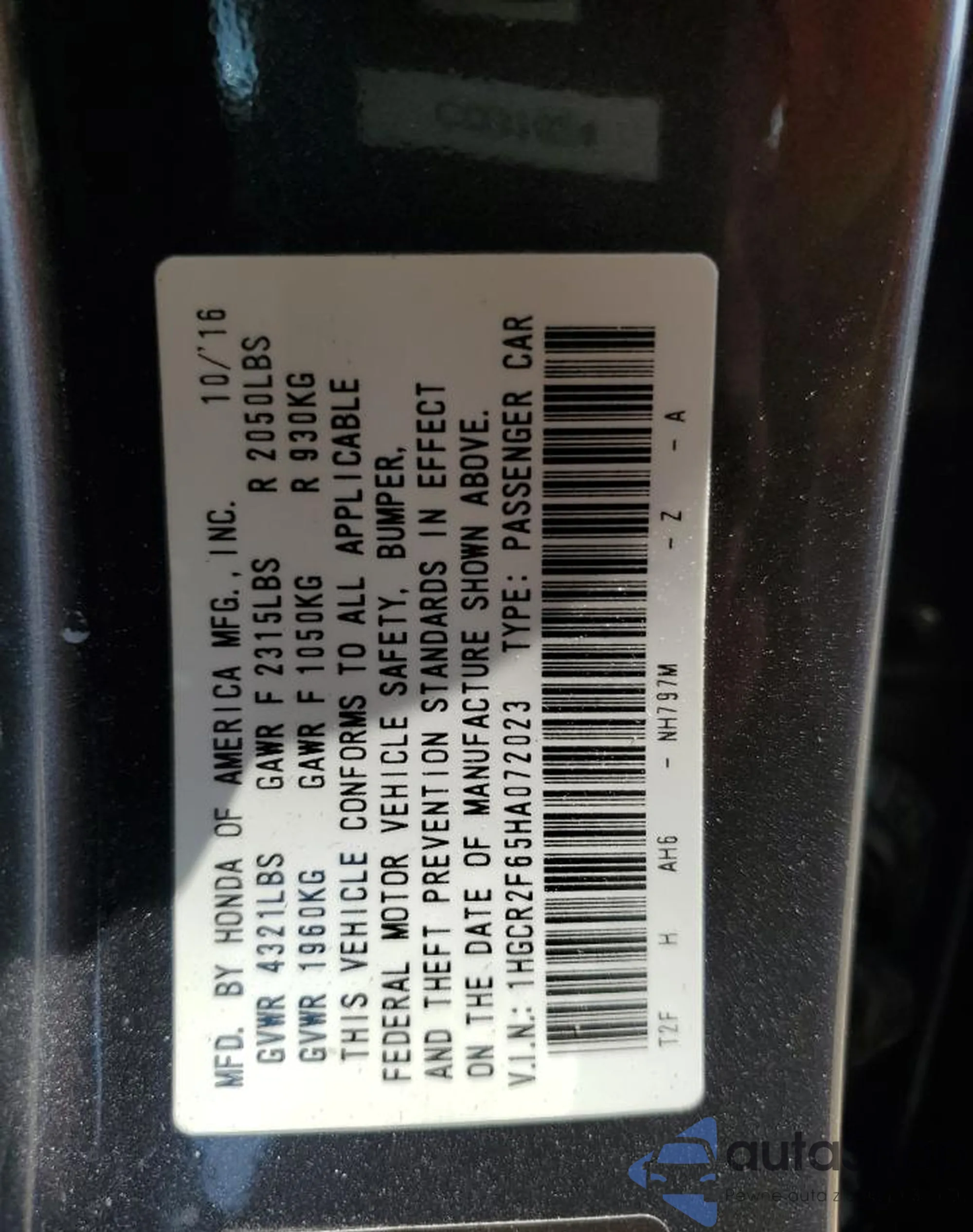 LOT: 59819445 VIN: 1HGCR2F65HA072023