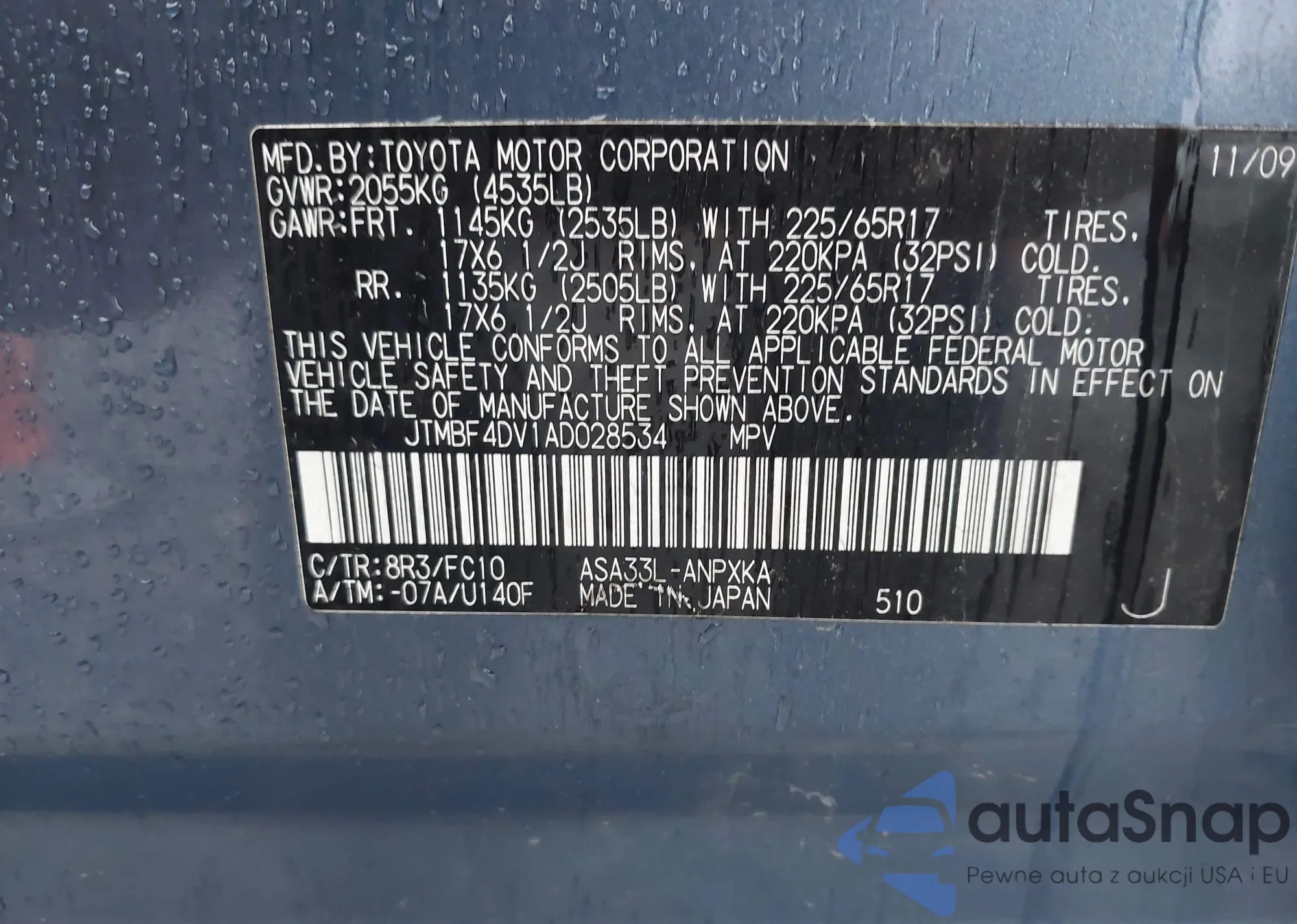 • VIN JTMBF4DV1AD028534