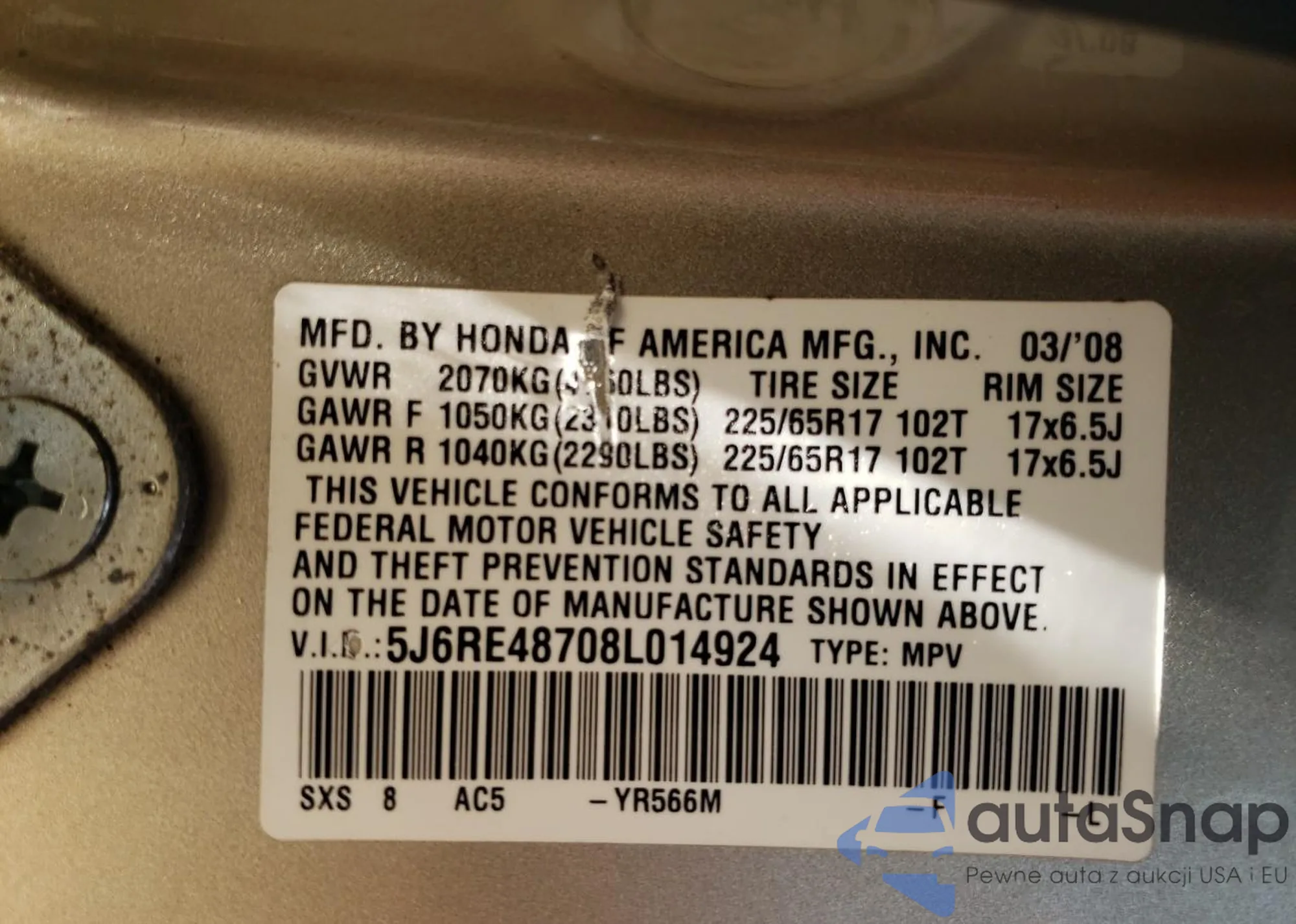 • VIN 5J6RE48708L014924