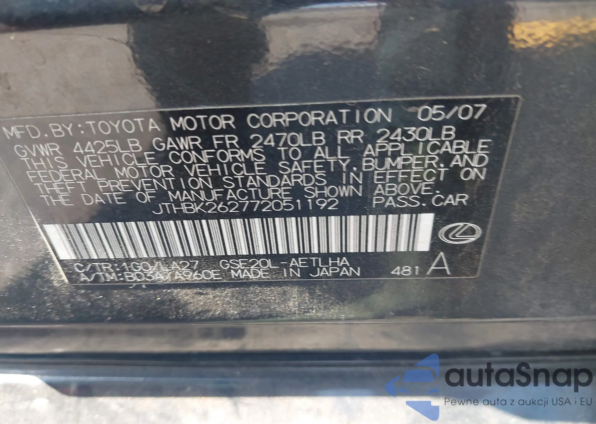 LOT: 42593448 VIN: JTHBK262772051192
