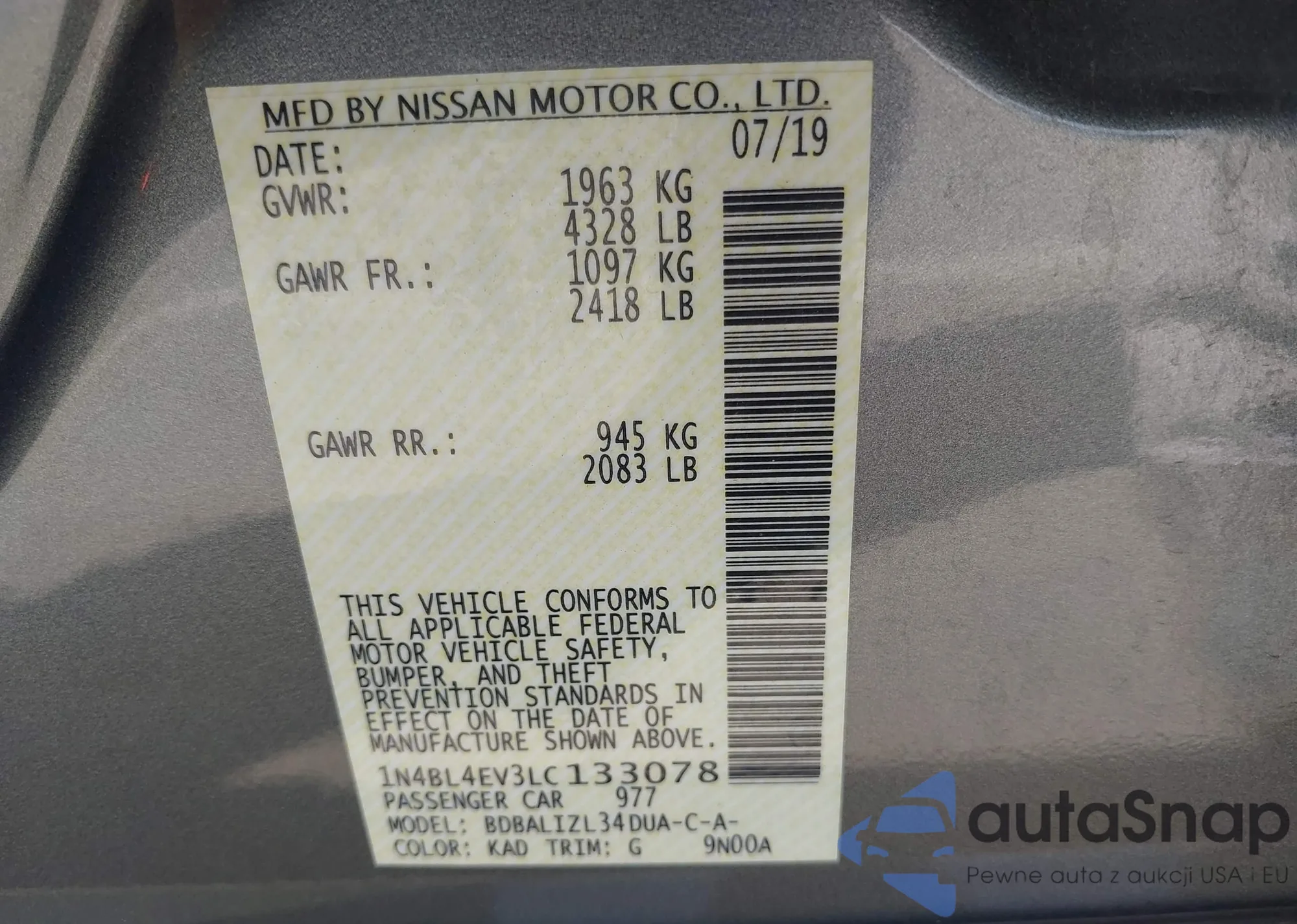 • VIN 1N4BL4EV3LC133078