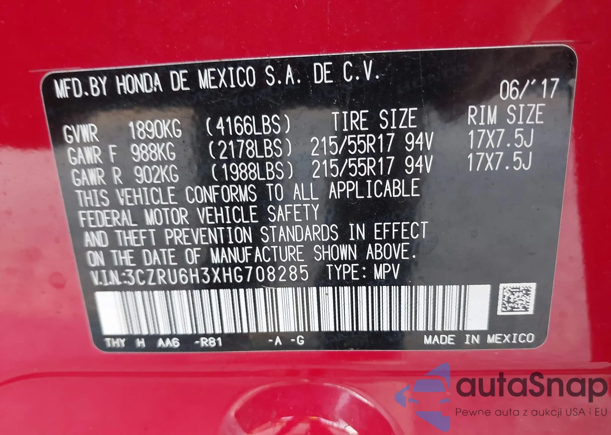 • VIN 3CZRU6H3XHG708285