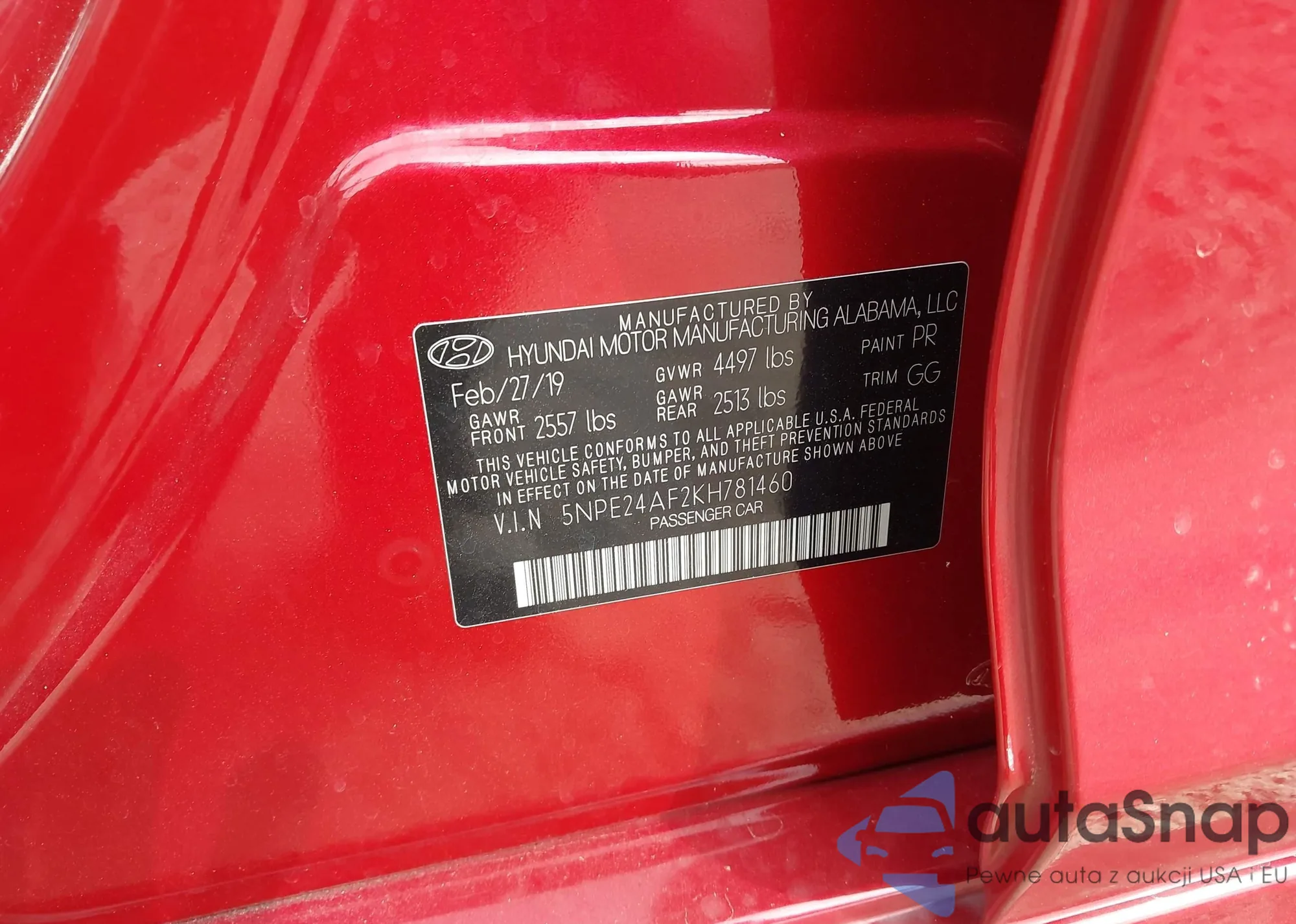 • VIN 5NPE24AF2KH781460