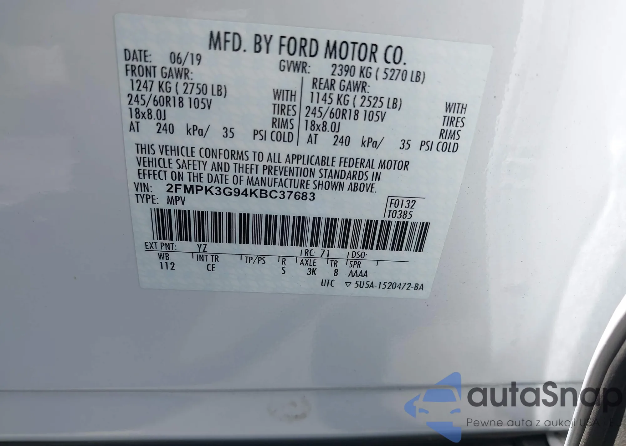 LOT: 42639602 VIN: 2FMPK3G94KBC37683
