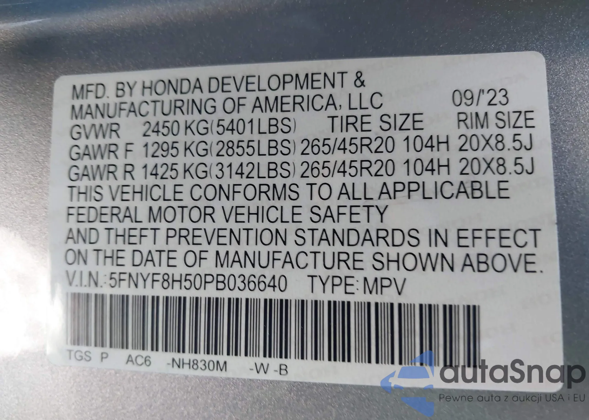 LOT: 42536022 VIN: 5FNYF8H50PB036640
