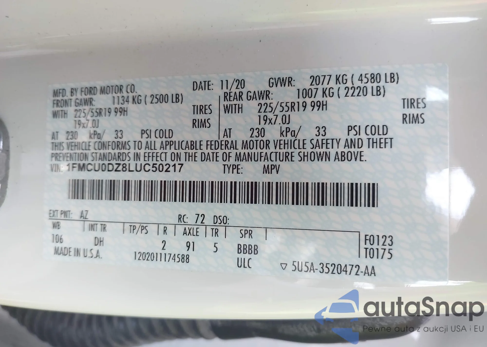 LOT: 42650800 VIN: 1FMCU0DZ8LUC50217