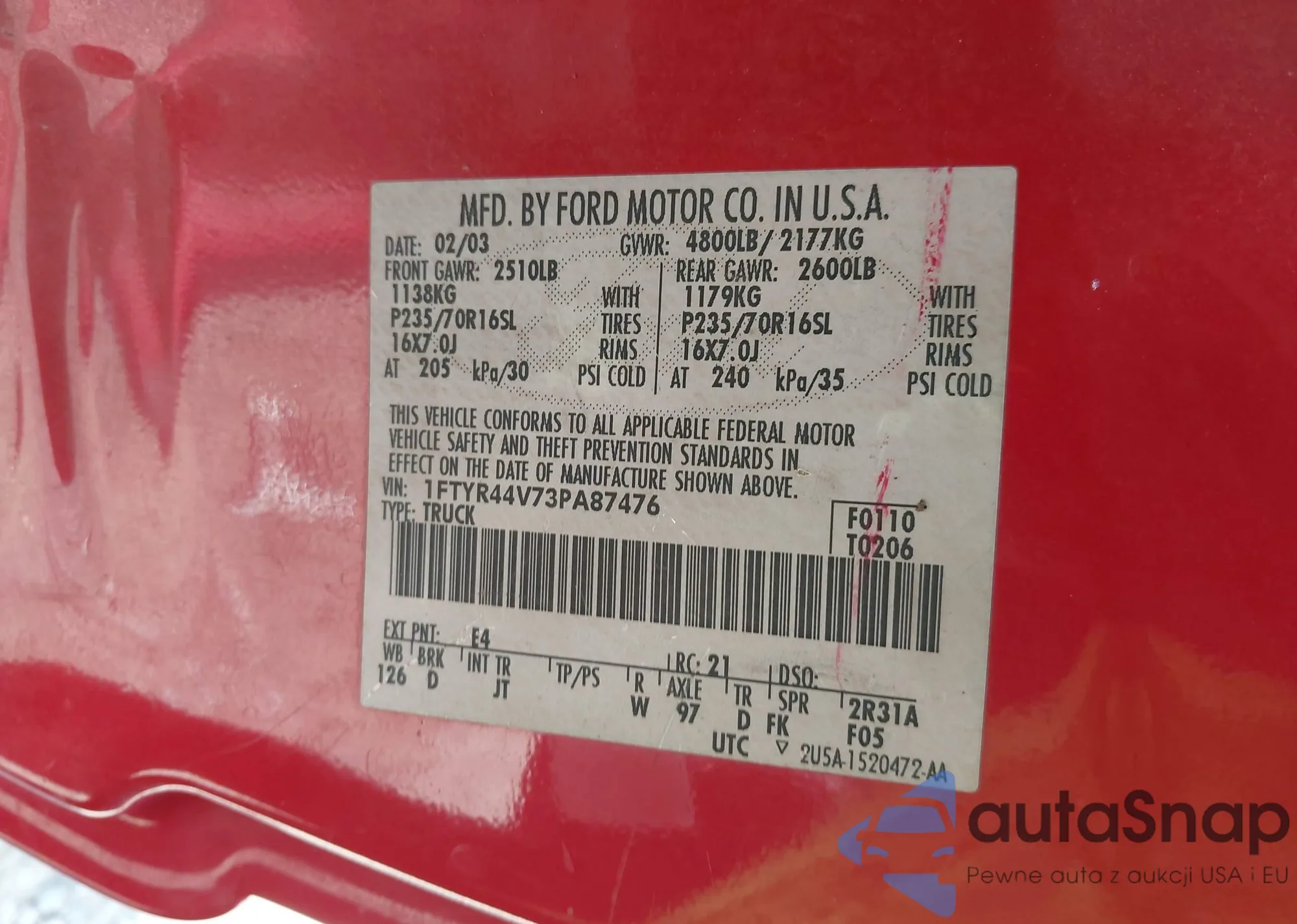 LOT: 42680732 VIN: 1FTYR44V73PA87476