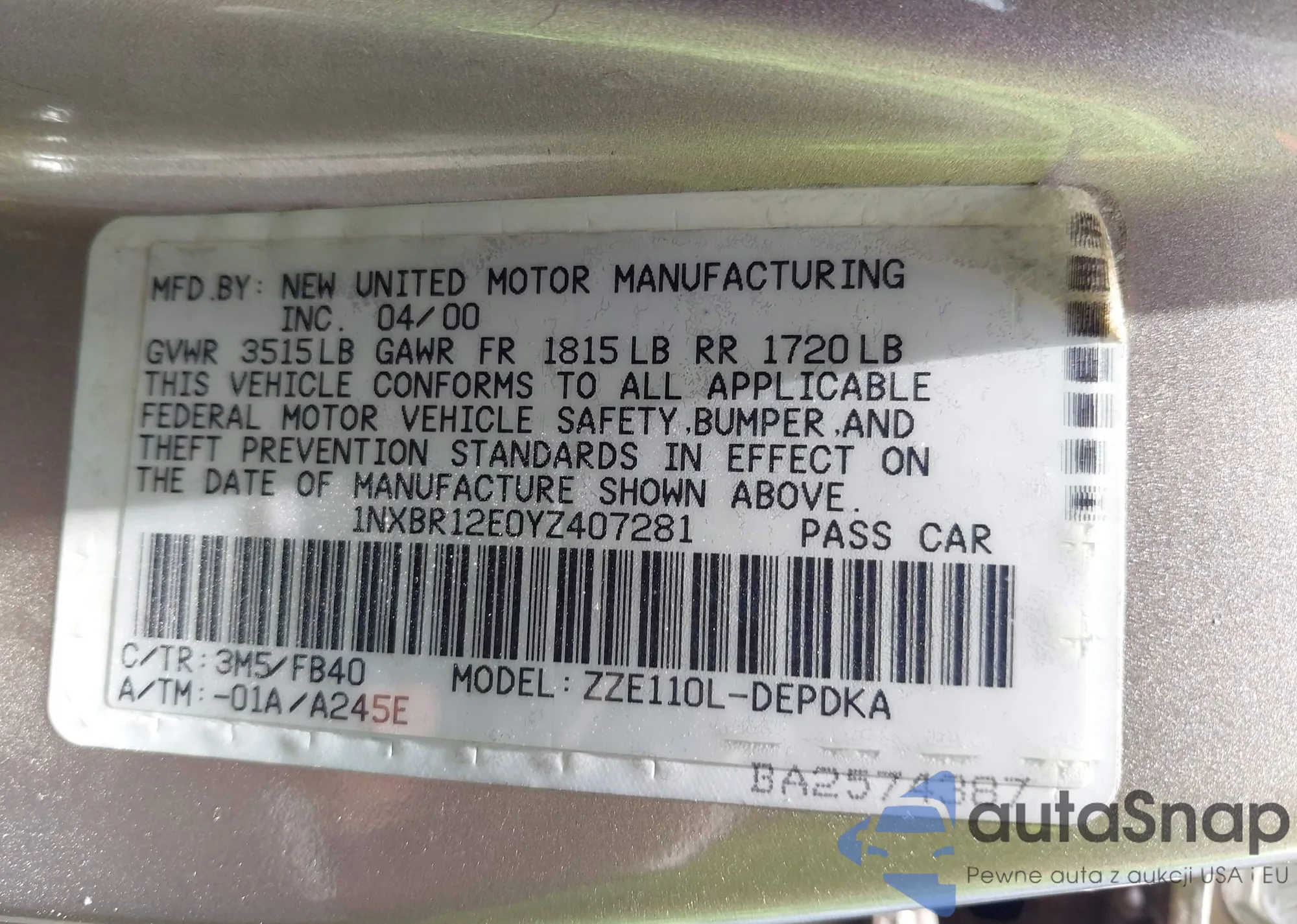 LOT: 42607475 VIN: 1NXBR12E0YZ407281
