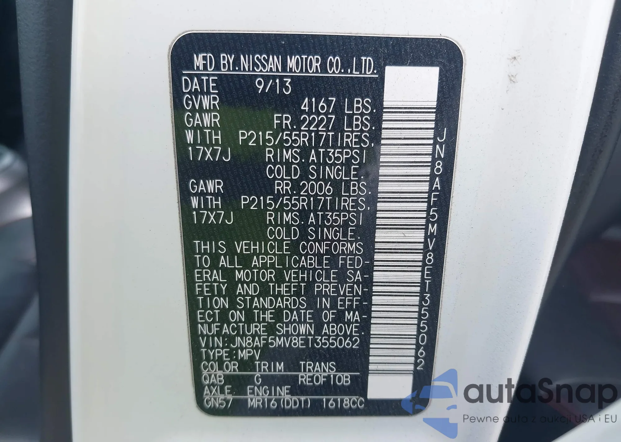• VIN JN8AF5MV8ET355062