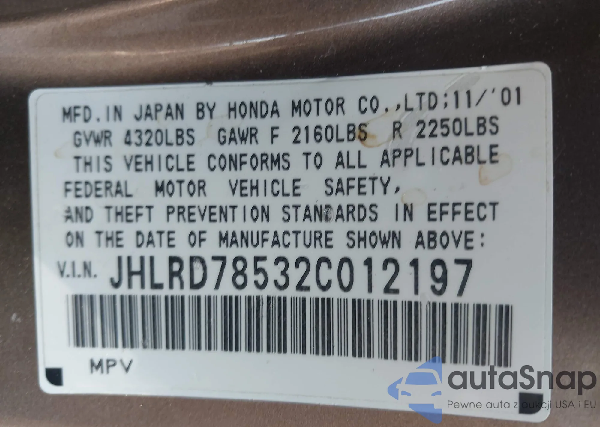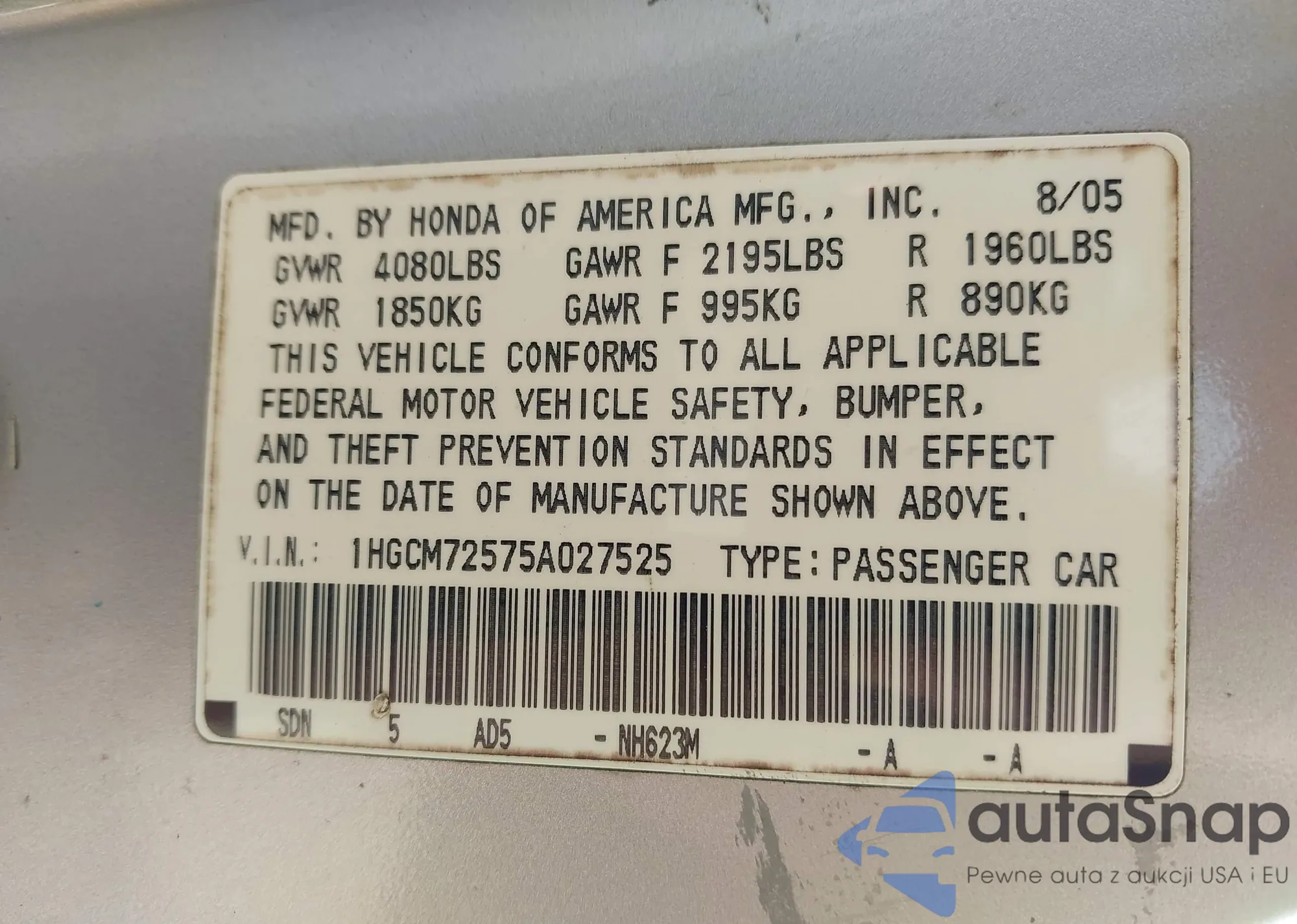 LOT: 42755641 VIN: 1HGCM72575A027525