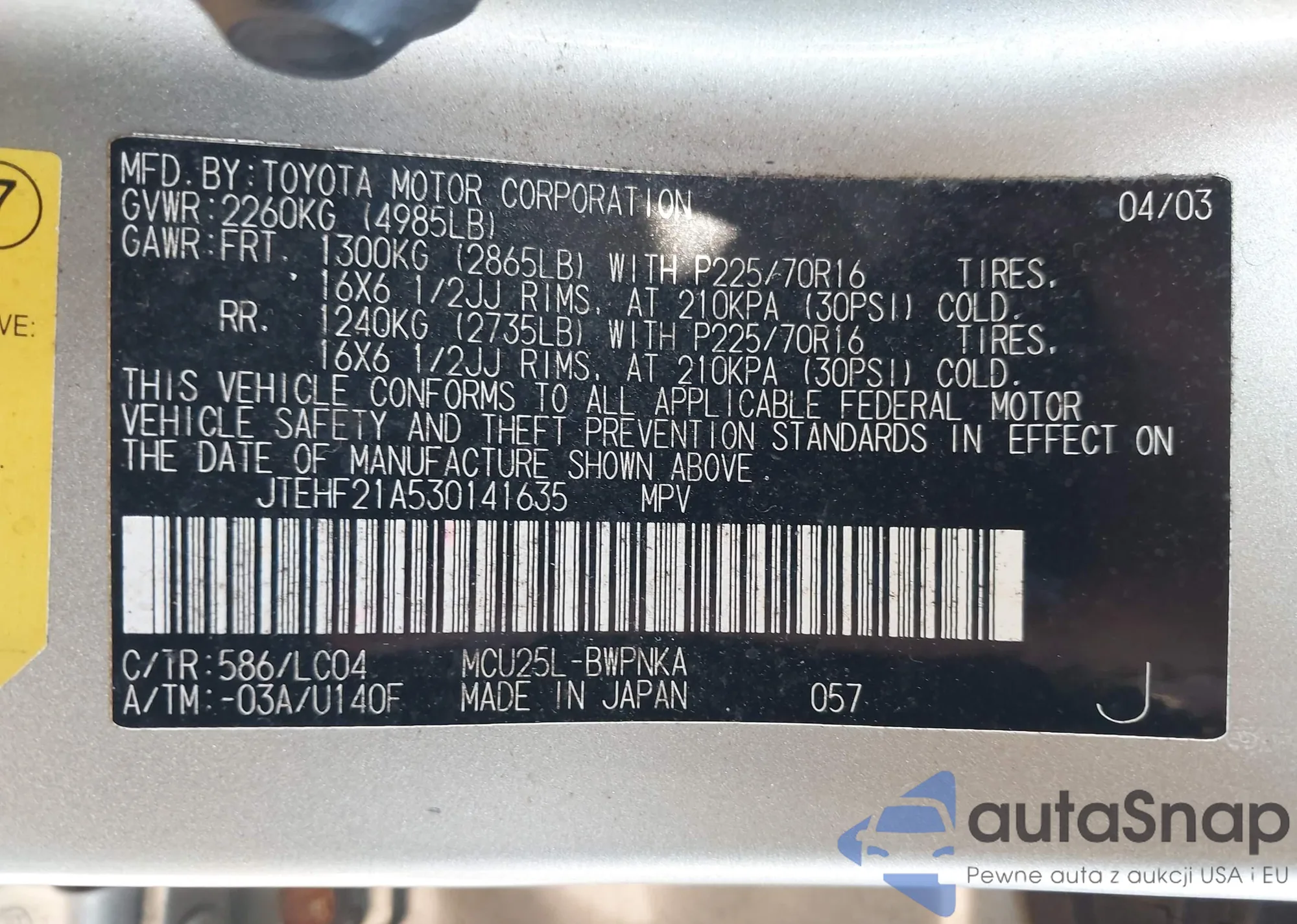 • VIN JTEHF21A530141635